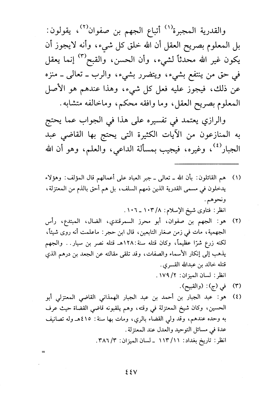 والقدرية المجبرة أتباع الجهم بن صفوان يقولون بل المعلوم بصريح العقل أن الله خلق كل شيء وأنه لا يجوز أن يكون غير الله محدثاً لشيء وأن الحسن والقبح إنما يعقل في حق من ينتفع بشيء ويتضرر بشيء والرب تعالى منزه عن ذلك فيجوز عليه فعل كل شيء وهذا عندهم هو الأصل المعلوم بصريح العقل وما وافقه محكم وما خالفه متشابه والرازي يعتمد في تفسيره على هذا في الجواب عما يحتج به المنازعون من الآيات الكثيرة التي يحتج بها القاضي عبد الجبار وغيره فيجيب بمسألة الداعي والعلم وهو أن الله