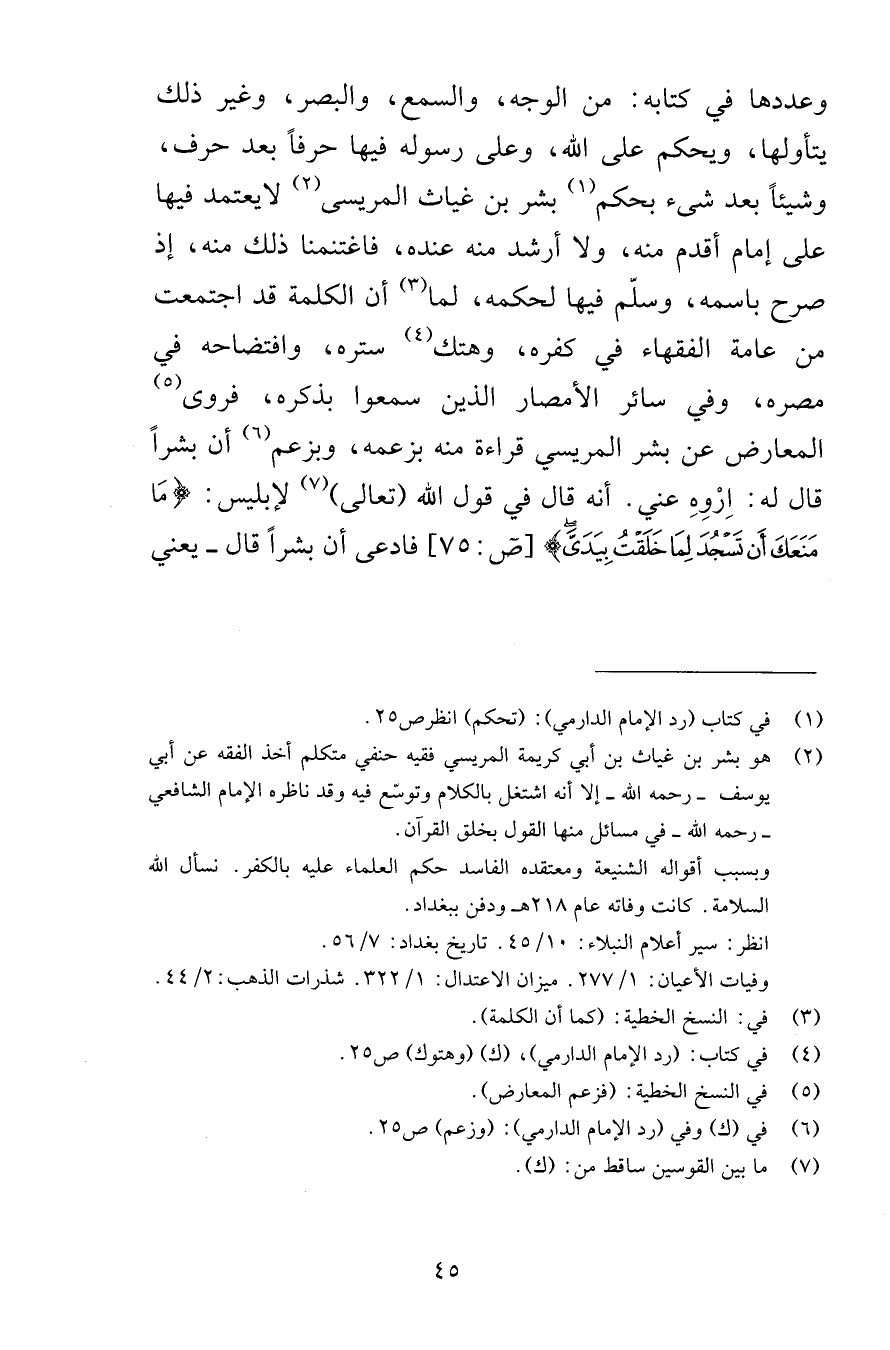 وعددها في كتابه من الوجه والسمع والبصر وغير ذلك يتأولها ويحكم على الله وعلى رسوله فيها حرفاً بعد حرف وشيئاً بعد شيء بحكم بشر بن غياث المريسي لا يعتمد فيها على إمام أقدم منه ولا أرشد منه عنده فاغتنمنا ذلك منه إذ صرح باسمه وسلّم فيها لحكمه لما أن الكلمة قد اجتمعت من عمة الفقهاء في كفره وهتك ستره وافتضاحه في مصره وفي سائر الأمصار الذين سمعوا بذكره فروى المعارض عن بشر المريسي قراءة منه بزعمه وبزعم أن بشراً قال له اِرْوِهِ عني أنه قال في قوله الله تعالى لإبليس مَا مَنَعَكَ أَنْ تَسْجُدَ لِمَا خَلَقْتُ بِيَدَيَّ [ص 75] فادعى أن بشراً قال يعني