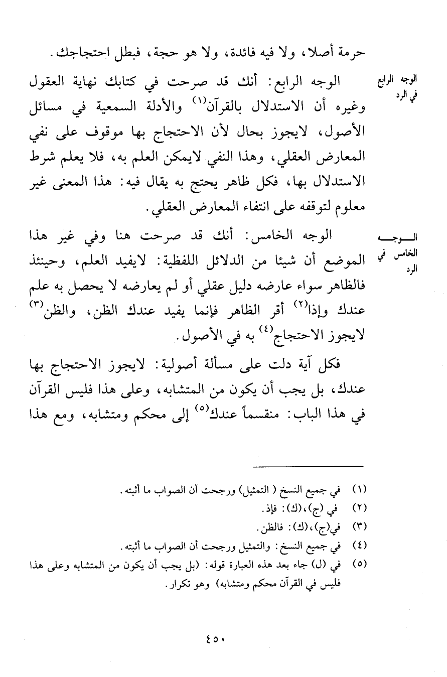 حرمة أصلا ولا فيه فائدة ولا هو حجة فبطل احتجاجك الوجه الرابع أنك قد صرحت في كتابك في نهاية العقول وغيره أن الاستدلال بالقرآن والأدلة السمعية في مسائل الأصول لا يجوز بحال لأن الاحتجاج بها موقوف على نفي المعارض العقلي وهذا النفي لا يمكن العلم به فلا يعلم شرط الاستدلال بها فكل ظاهر يحتج به يقال فيه هذا المعنى غير معلوم لتوقفه على انتفاء المعارض العقلي الوجه الخامس أنك قد صرحت هنا وفي غير هذا الموضع أن شيئا من الدلائل اللفظية لا يفيد العلم وحينئذ فالظاهر سواء عارضه دليل عقلي أو لم يعارضه لا يحصل به علم عندك وإذا أقر الظاهر فإنما يفيد عندك الظن والظن لا يجوز الاحتجاج به في الأصول فكل آية دلت على مسألة أصولية لا يجوز الاحتجاج بها عندك بل يجب أن يكون من المتشابه وعلى هذا فليس القرآن في هذا الباب منقسماً عندك إلى محكم ومتشابه ومع هذا