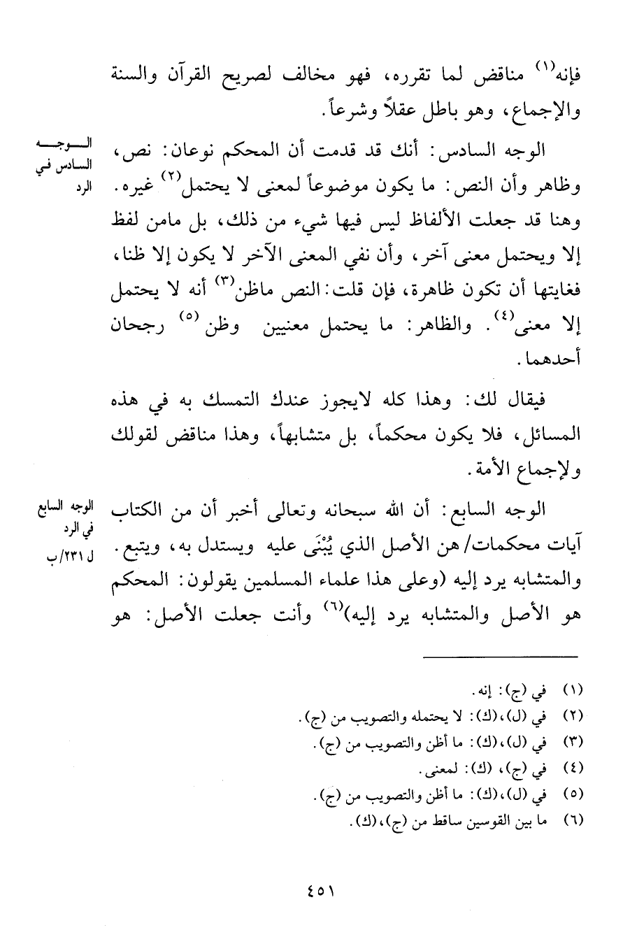فإنه مناقض لما تقرره فهو مخالف لصريح القرآن والسنة والإجماع وهو باطل عقلاً وشرعاً الوجه السادس أنك قد قدمت أن المحكم نوعان نص وظاهر وأن النص ما يكون موضوعاً لمعنى لا يحتمل غيره وهنا قد جعلت الألفاظ ليس فيها شيء من ذلك بل ما من لفظ إلا ويحتمل معنى آخر وأن نفي المعنى الآخر لا يكون إلا ظنا فغايتها أن تكون ظاهرة فإن قلت النص ما ظن أنه لا يحتمل إلا معنى والظاهر ما يحتمل معنيين وظن رجحان أحدهما فيقال لك وهذا كله لا يجوز عندك التمسك به في هذه المسائل فلا يكون محكماً بل متشابهاً وهذا مناقض بقولك ولإجماع الأمة الوجه السابع أن الله سبحانه وتعالى أخبر أن من الكتاب آيات محكمات هن الأصل الذي يُبْنَى عليه ويستدل به ويتبع والمتشابه يرد إليه وعلى هذا علماء المسلمين يقولون المحكم هو الأصل والمتشابه يرد إليه وأنت جعلت الأصل هو