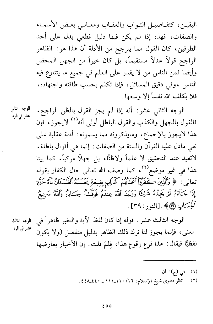 اليقين كتفاصيل الثواب والعقاب ومعاني بعض الأسماء والصفات فهذه إذا لم يكن فيها دليل قطعي يدل على أحد الطرفين كان القول مما يترجح من الأدلة أن هذا هو الظاهر الراجح قولاً عدلاً مستقيماً بل كان خيراً من الجهل المحض وأيضا فمن الناس من لا يقدر على العلم في جميع ما يتنازع فيه الناس وفي دقيق المسائل فإذا تكلم بحسب طاقته واجتهاده فلا يكلف الله نفساً إلا وسعها الوجه الثاني عشر أنه إذا لم يجز القول بالظن الراجح فالقول بالجهل والكذب والقول الباطل أولى أنه لا يجوز فإن هذا لا يجوز بالإجماع وما يذكرونه مما يسمونه أدلة عقلية على نفي ما دل عليه القرآن والسنة من الصفات إنما هي أقوال باطلة لا تفيد عند التحقيق لا علماً ولا ظنًّا بل جهلاً مركباً كما بينا هذا في غير موضع كما وصف الله تعالى حال الكفار بقوله تعالى وَالَّذِينَ كَفَرُوا أَعْمَالُهُمْ كَسَرَابٍ بِقِيعَةٍ يَحْسَبُهُ الظَّمْآنُ مَاءً حَتَّى إِذَا جَاءَهُ لَمْ يَجِدْهُ شَيْئًا وَوَجَدَ اللَّهَ عِنْدَهُ فَوَفَّاهُ حِسَابَهُ وَاللَّهُ سَرِيعُ الْحِسَابِ (39) [النور 39] الوجه الثالث عشر قوله إذا كان لفظ الآية والخبر ظاهراً في معنى فإنما يجوز لنا ترك ذلك الظاهر بدليل منفصل ولا يكون لفظيًّا فيقال هذا قرع وقوع هذا فِلمَ قلت إن الأخبار يعارضها