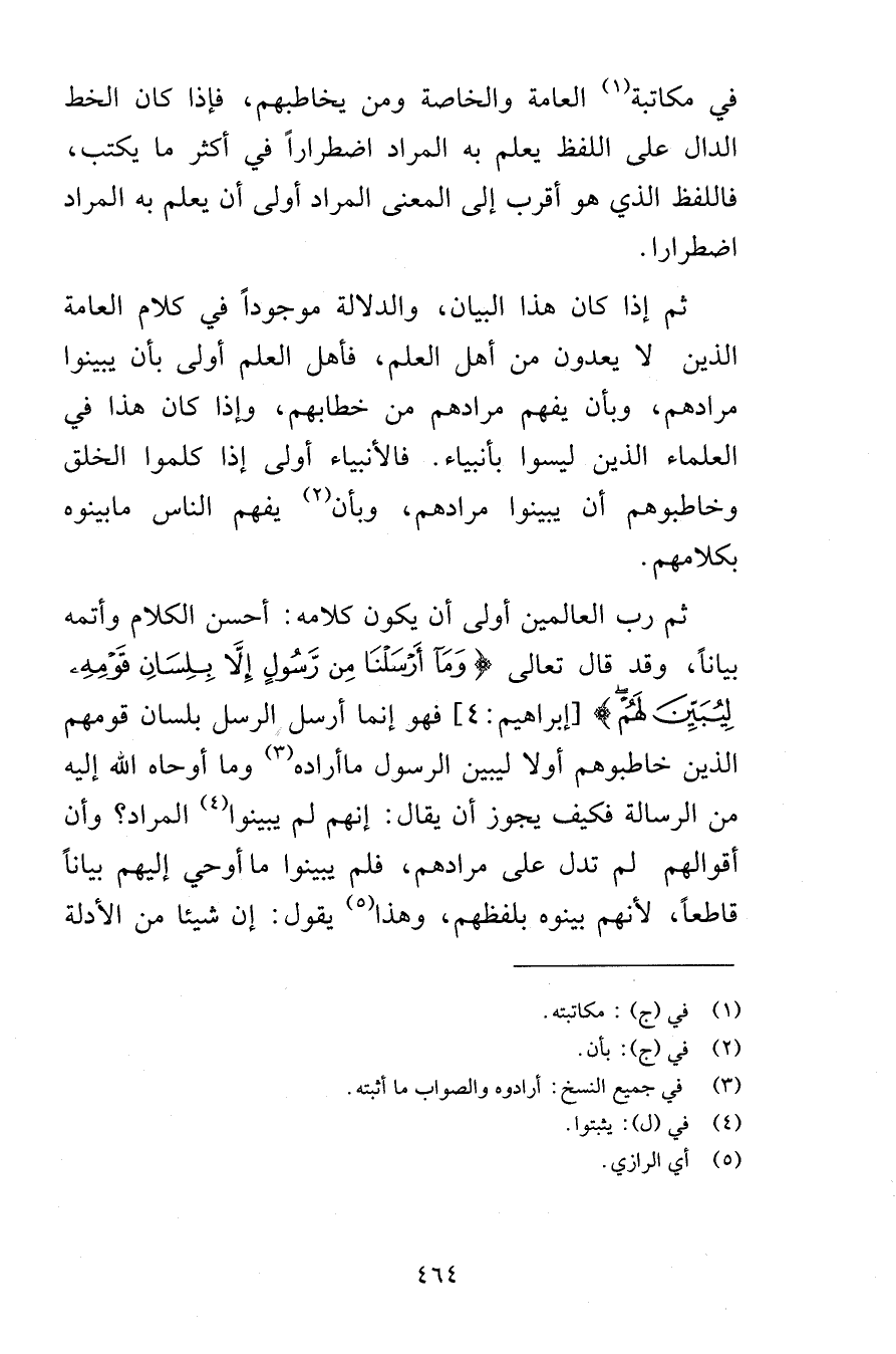في مكاتبة العامة والخاصة ومن يخاطبهم فإذا كان الخط الدال على اللفظ يعلم به المراد اضطراراً في أكثر ما يكتب فاللفظ الذي هو أقرب إلى المعنى المراد أولى أن يعلم به المراد اضطرارا ثم إذا كان هذا البيان والدلالة موجوداً في كلام العامة الذين لا يعدون من أهل العلم فأهل العلم أولى بأن يبينوا مرادهم وأن يفهم مرادهم من خطابهم وإذا كان هذا في العلماء الذين ليسوا بأنبياء فالأنبياء أولى إذا كلموا الخلق وخاطبوهم أن يبينوا مرادهم وبأن يفهم الناس ما بينوه بكلامهم ثم رب العالمين أولى أن يكون كلامه أحسن الكلام وأتمه بياناً وقد قال تعالى وَمَا أَرْسَلْنَا مِنْ رَسُولٍ إِلَّا بِلِسَانِ قَوْمِهِ لِيُبَيِّنَ لَهُمْ [إبراهيم 4] فهو إنما أرسل الرسل بلسان قومهم الذين خاطبوهم أولا ليبن الرسول ما أراده وما أوحاه الله إليه من الرسالة فكيف يجوز أن يقال إنهم لم يبينوا المراد وأن أقوالهم لم تدل على مرادهم فلم يبينوا ما أوحي إليهم بياناً قاطعاً لأنهم بينوه بلفظهم وهذا يقول إن شيئا من الأدلة