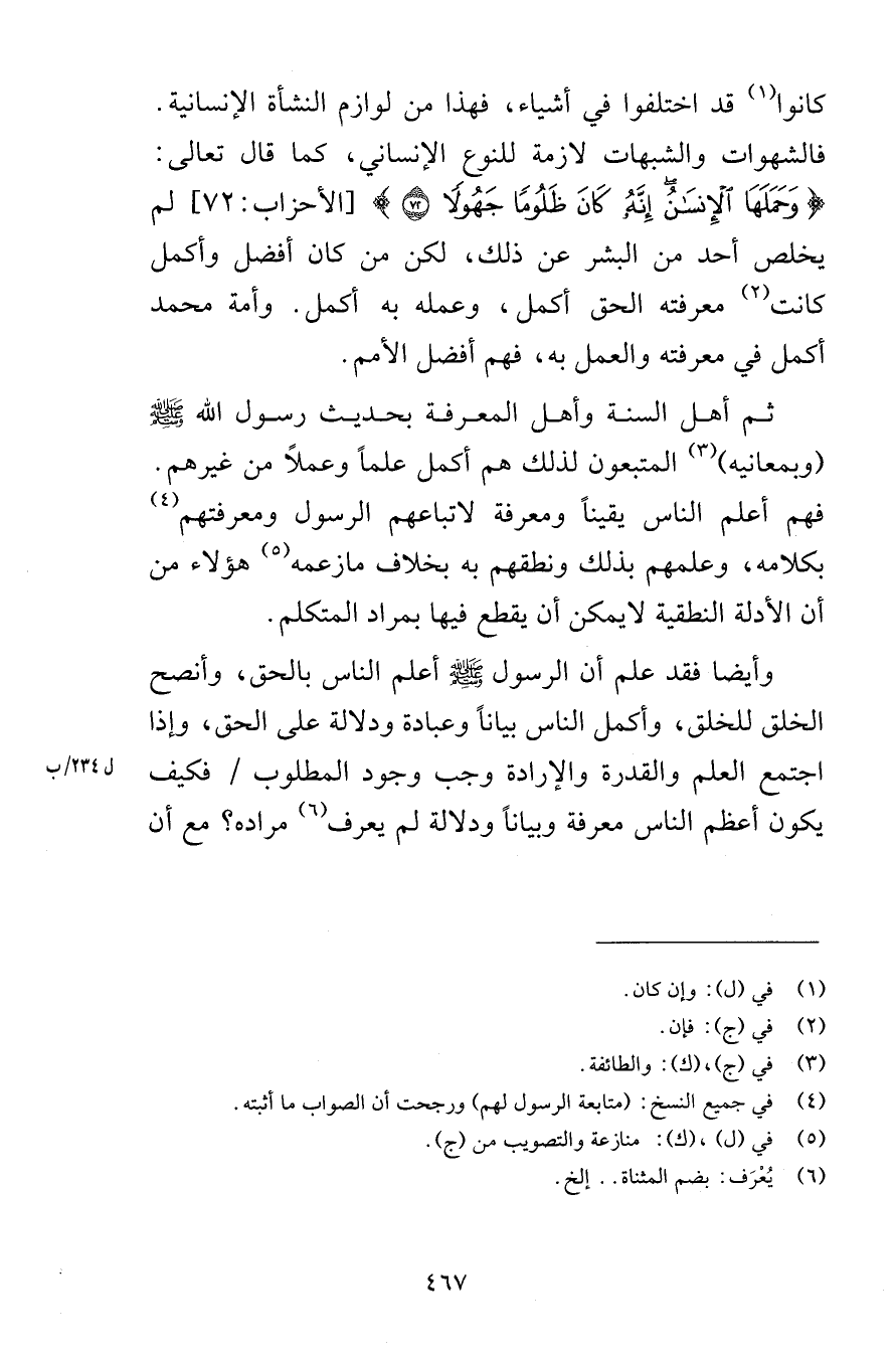 كانوا قد اختلفوا في أشياء فهذا من لوازم النشأة الإنسانية فالشهوات والشبهات لازمة للنوع الإنساني كما قال تعالى وَحَمَلَهَا الْإِنْسَانُ إِنَّهُ كَانَ ظَلُومًا جَهُولًا (72) [الأحزاب 72] لم يخلص أحد من البشر عن ذلك لكن من كان أفضل وأكمل كانت معرفته بالحق أكمل وعمله به أكمل وأمة محمد أكمل في معرفته والعمل به فهم أفضل الأمم ثم أهل السنة وأهل المعرفة بحديث رسول الله صلى الله عليه وسلم وبمعانيه والمتبعون لذلك هم أكمل علماً وعملاً من غيرهم فهم أعلم الناس يقيناً ومعرفة لاتباعهم الرسول ومعرفتهم بكلامه وعلمهم بذلك ونطقهم به بخلاف ما زعمه هؤلاء من أن الأدلة النطقية لا يمكن أن يقطع فيها بمراد المتكلم وأيضا فقد علم أن الرسول صلى الله عليه وسلم أعلم الناس بالحق وأنصح الخلق للخلق وأكمل الناس بياناً وعبادة ودلالة على الحق وإذا اجتمع العلم والقدرة والإرادة وجب وجود المطلوب فكيف يكون أعظم الناس معرفة وبياناً ودلالة لم يعرف مراده مع أن