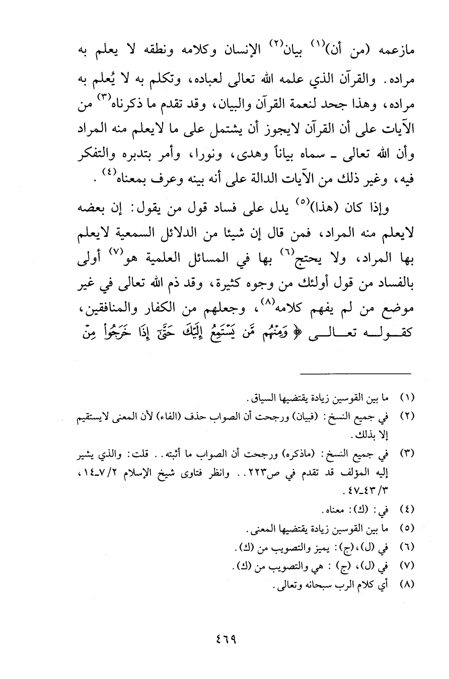 ما زعمه من أن بيان الإنسان وكلامه ونطقه لا يعلم به مراده والقرآن الذي علمه الله تعالى لعباده وتكلم به لا يُعلم به مراده وهذا جحد لنعمة القرآن والبيان وقد تقدم ما ذكرناه من الآيات على أن القرآن لا يجوز أن يشتمل على ما لا يعلم منه المراد وأن الله تعالى سماه بياناً وهدى ونورا وأمر بتدبره والتفكر فيه وغير ذلك من الآيات الدالة على أنه بينه وعرف بمعناه وإذا كان هذا يدل على فساد قول من يقول إن بعضه لا يعلم منه المراد فمن قال إن شيئا من الدلائل السمعية لا يعلم بها المراد ولا يحتج بها في المسائل العلمية هو أولى بالفساد من قول أولئك من وجوه كثيرة وقد ذم الله تعالى في غير موضع من لم يفهم كلامه وجعلهم من الكفار والمنافقين كقوله تعالى وَمِنْهُمْ مَنْ يَسْتَمِعُ إِلَيْكَ حَتَّى إِذَا خَرَجُوا مِنْ