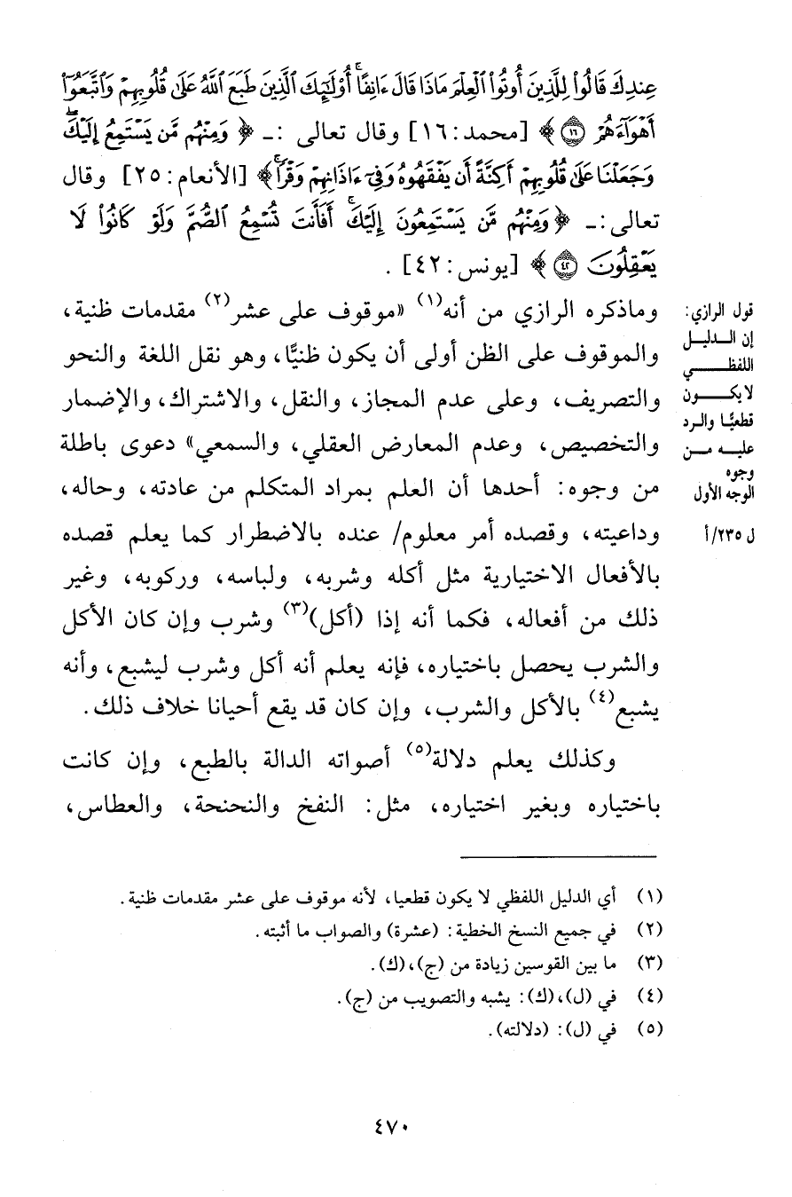عِنْدِكَ قَالُوا لِلَّذِينَ أُوتُوا الْعِلْمَ مَاذَا قَالَ آنِفًا أُولَئِكَ الَّذِينَ طَبَعَ اللَّهُ عَلَى قُلُوبِهِمْ وَاتَّبَعُوا أَهْوَاءَهُمْ (16) [محمد 16] وقال تعالى وَمِنْهُمْ مَنْ يَسْتَمِعُ إِلَيْكَ وَجَعَلْنَا عَلَى قُلُوبِهِمْ أَكِنَّةً أَنْ يَفْقَهُوهُ وَفِي آذَانِهِمْ وَقْرًا [الأنعام 25] وقال تعالى وَمِنْهُمْ مَنْ يَسْتَمِعُونَ إِلَيْكَ أَفَأَنْتَ تُسْمِعُ الصُّمَّ وَلَوْ كَانُوا لَا يَعْقِلُونَ (42) [يونس 42] وما ذكره الرازي من أنه موقوف على عشر مقدمات ظنية والموقوف على الظن أولى أن يكون ظنيًّا وهو نقل اللغة والنحو والتصريف وعلى عدم المجاز والنقل والاشتراك والإضمار والتخصيص وعدم المعارض العقلي والسمعي دعوى باطلة من وجوه أحدها أن العلم بمراد المتكلم من عادته وحاله وداعيته وقصده أمر معلوم عنده بالاضطرار كما قصده بالأفعال الاختيارية مثل أكله وشربه ولباسه وركوبه وغير ذلك من أفعاله فكما أنه إذا أكل وشرب وإن كان الأكل والشرب يحصل باختياره فإنه يعلم أنه أكل وشرب ليشبع وأنه يشبع بالأكل والشرب وإن كان قد يقع أحيانا خلاف ذلك وكذلك يعلم دلالة أصواته الدالة بالطبع وإن كانت باختياره وبغير اختياره مثل النفخ والنحنحة والعطاس