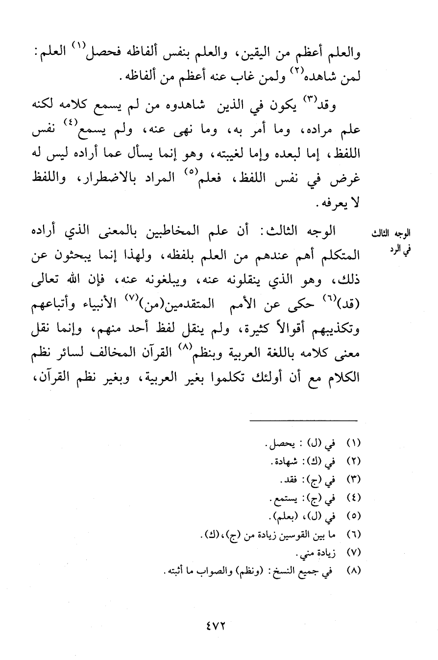 والعلم أعظم من اليقين والعلم بنفس ألفاظه فحصل العلم لمن شاهده ولمن غاب عنه أعظم من ألفاظه وقد يكون في الذين شاهدوه من لم يسمع كلامه لكنه علم مراده وما أمر به وما نهى عنه ولم يسمع نفس اللفظ إما لبعده وإما لغيبته وهو إنما يسأل عما أراده ليس له غرض في نفس اللفظ فعلم المراد بالاضطرار واللفظ لا يعرفه الوجه الثالث أن علم المخاطبين بالمعنى الذي أراده المتكلم أهم عندهم من العلم بلفظه ولهذا إنما يبحثون عن ذلك وهو الذي ينقلونه عنه ويبلغونه عنه فإن الله تعالى قد حكى عن الأمم المتقدمين من الأنبياء وأتباعهم وتكذيبهم أقوالاً كثيرة ولم ينقل لفظ أحد منهم وإنما نقل معنى كلامه باللغة العربية وبنظم القرآن المخالف لسائر نظم الكلام مع أن أولئك تكلموا بغير العربية وبغير نظم القرآن