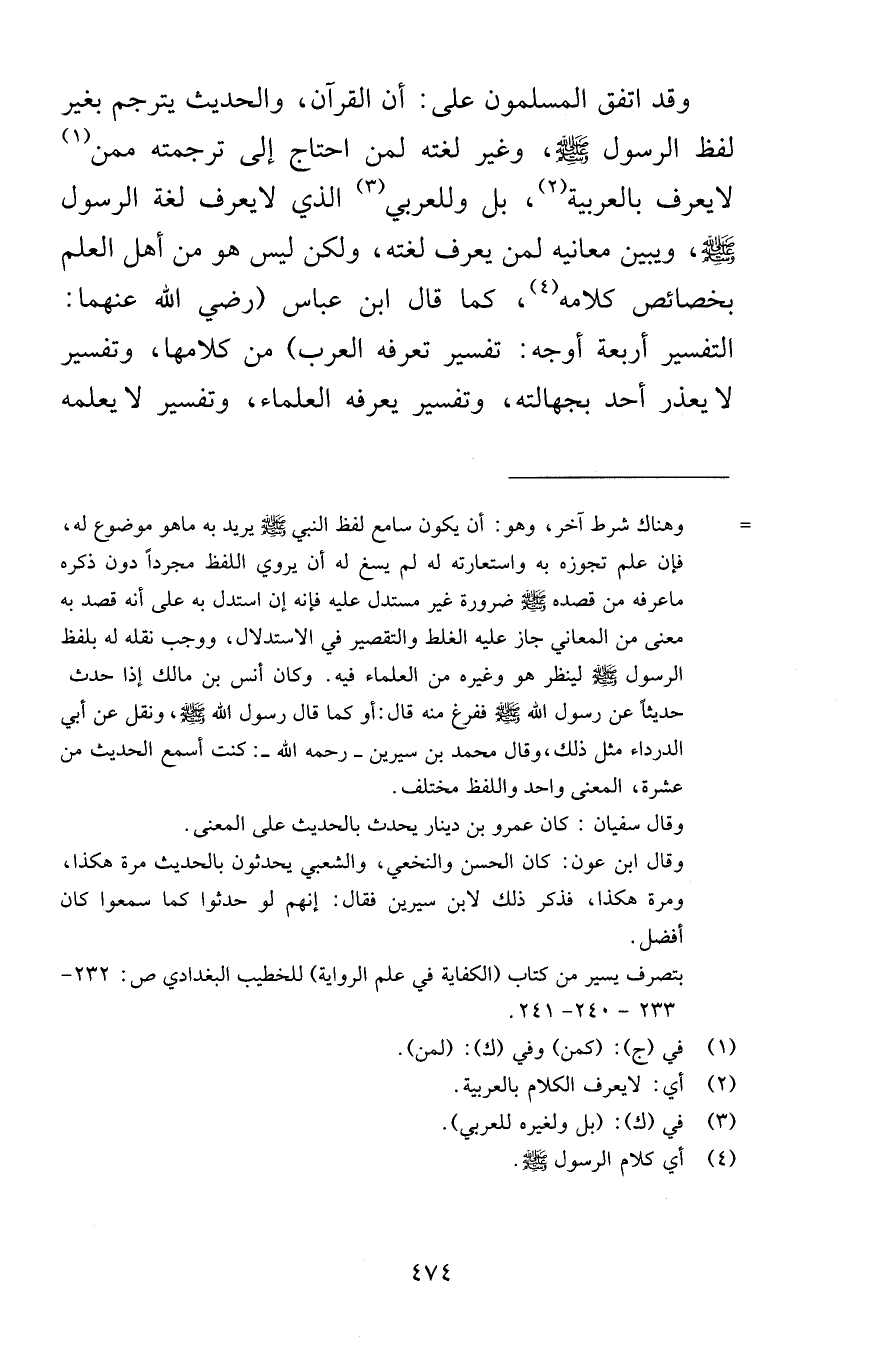 وقد اتفق المسلمون على أن القرآن والحديث يترجم بغير لفظ الرسول صلى الله عليه وسلم وغير لغته لمن احتاج إلى ترجمته ممن لا يعرف بالعربية بل وللعربي الذي لا يعرف لغة الرسول صلى الله عليه وسلم ويبين معانيه لمن يعرف لغته ولكن ليس هو من أهل العلم بخصائص كلامه كما قال ابن عباس رضي الله عنهما التفسير أربعة أوجه تفسير تعرفه العرب من كلامها وتفسير لا يعذر أحد بجهالته وتفسير يعرفه العلماء وتفسير لا يعلمه