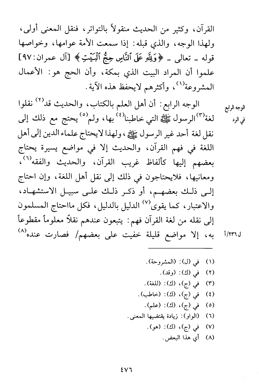 القرآن وكثير من الحديث منقولاً بالتواتر فنقل المعنى أولى ولهذا الوجه والذي قبله إذا سمعت الأمة عوامها وخواصها قوله تعالى وَلِلَّهِ عَلَى النَّاسِ حِجُّ الْبَيْتِ [آل عمران 97] علموا أن المراد البيت الذي بمكة وأن الحج هو الأعمال المشروعة وأكثرهم لا يحفظ هذه الآية الوجه الرابع أن أهل العلم بالكتاب والحديث قد نفلوا لغة الرسول صلى الله عليه وسلم التي خاطبنا بها ولم يحتج مع ذلك إلى نقل لغة أحد غير الرسول صلى الله عليه وسلم ولهذا لا يحتاج علماء الدين إلى أهل اللغة في فهم القرآن والحديث إلا في مواضع يسيرة يحتاج بعضهم إليها كألفاظ غريب القرآن والحديث والفقه ومعانيها فلا يحتاجون في ذلك إلى نقل أهل اللغة وإن احتاج إلى ذلك بعضهم أو ذكر ذلك على سبيل الاستشهاد والاعتبار كما يقوى الدليل بالدليل فكل ما احتاج المسلمون إلى نقله من لغة القرآن فهم يتبعون عندهم نقلاً معلوماً مقطوعاً به إلا مواضع قليلة خفيت على بعضهم فصارت عنده