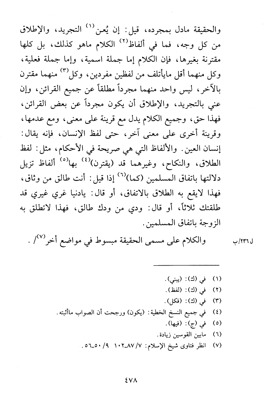 والحقيقة ما دل بمجرده قيل إن يُعن التجريد والإطلاق من كل وجه فما في ألفاظ الكلام ما هو كذلك بل كلها مقترنة بغيرها فإن الكلام إما جملة اسمية وإما جملة فعلية وكل منهما أقل ما يأتلف من لفظين مفردين وكل منهما مقترن بالآخر ليس واحد منهما مجرداً مطلقاً عن جميع القرائن وإن عنى بالتجريد والإطلاق أن يكون مجرداً عن بعض القرائن فهذا حق وجميع الكلام يدل مع قرينة على معنى ومع عدمها وقرينة أخرى على معنى آخر حتى لفظ الإنسان فإنه يقال إنسان العين والألفاظ التي هي صريحة في الأحكام مثل لفظ الطلاق والنكاح وغيرهما قد يقترن بها ألفاظ تزيل دلالتها باتفاق المسلمين كما إذا قيل أنت طالق من وثاق فهذا لا يقع به الطلاق بالاتفاق أو قال يا دنيا غري غيري قد طلقتك ثلاثاً أو قال ودي من ودك طالق فهذا لا تطلق به الزوجة باتفاق المسلمين والكلام على مسمى الحقيقة مبسوط في مواضع أخر