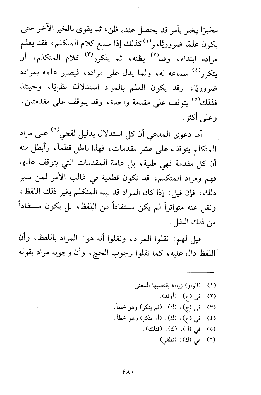 مخبرًا يخبر بأمر قد يحصل عنده ظن ثم يقوى بالخبر الآخر حتى يكون علمًا ضروريًّا وكذلك إذا سمع كلام المتكلم فقد يعلم مراده ابتداء وقد يظنه ثم يتكرر كلام المتكلم أو يتكرر سماعه له ولما يدل على مراده فيصير علمه بمراده ضروريّا وقد يكون العلم بالمراد استدلاليّا نظريّا وحينئذ فذلك يتوقف على مقدمة واحدة وقد يتوقف على مقدمتين وعلى أكثر أما دعوى المدعي أن كل استدلال بدليل لفظي على مراد المتكلم يتوقف على عشر مقدمات فهذا باطل قطعاً وأبطل منه أن كل مقدمة فهي ظنية بل عامة المقدمات التي يتوقف عليها فهم ومراد المتكلم وقد تكون قطعية في غالب الأمر لمن تدبر ذلك فإن قيل إذا كان المراد قد بينه المتكلم بغير ذلك اللفظ ونقل عنه متواتراً لم يكن مستفاداً من اللفظ بل يكون مستفاداً من ذلك النقل قيل لهم نقلوا المراد ونقلوا أنه هو المراد باللفظ وأن اللفظ دال عليه كما نقلوا وجوب الحج وأن وجوبه مراد بقوله