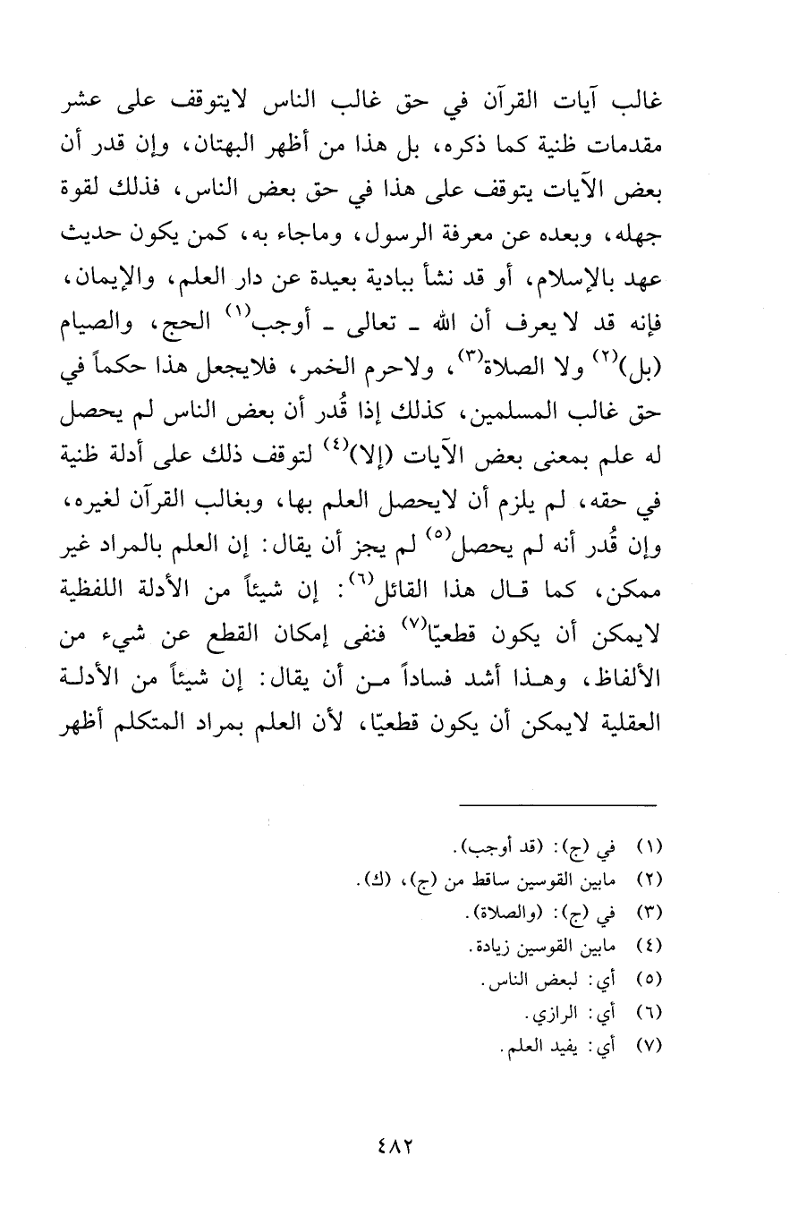 غالب آيات القرآن في حق غالب الناس لا يتوقف على عشر مقدمات ظنية كما ذكره بل هذا من أظهر البهتان وإن قدر إن بعض الآيات يتوقف على هذا في حق بعض الناس فذلك لقوة جهله وبعده عن معرفة الرسول وما جاء به كمن يكون حديث عهد بالإسلام أو قد نشأ ببادية بعيدة عن دار العلم والإيمان فإنه قد لا يعرف أن الله تعالى أوجب الحج والصيام بل ولا الصلاة ولا حرم الخمر فلا يجعل هذا حكماً في حق غالب المسلمين كذلك إذا قُدر أن بعض الناس لم يحصل له علم بمعنى بعض الآيات إلا لتوقف ذلك على أدلة ظنية في حقه لم يلزم أن لا يحصل العلم بها وبغالب القرآن لغيره وإن قُدر أنه لم يحصل لم يجز أن يقال إن العلم بالمراد غير ممكن كما قال هذا القائل إن شيئاً من الأدلة اللفظية لا يمكن أن يكون قطعيّا فنفي إمكان القطع عن شيء من الألفاظ وهذا أشد فساداً من أن يقال إن شيئاً من الأدلة العقلية لا يمكن أن يكون قطعيّا لأن العلم بمراد المتكلم أظهر