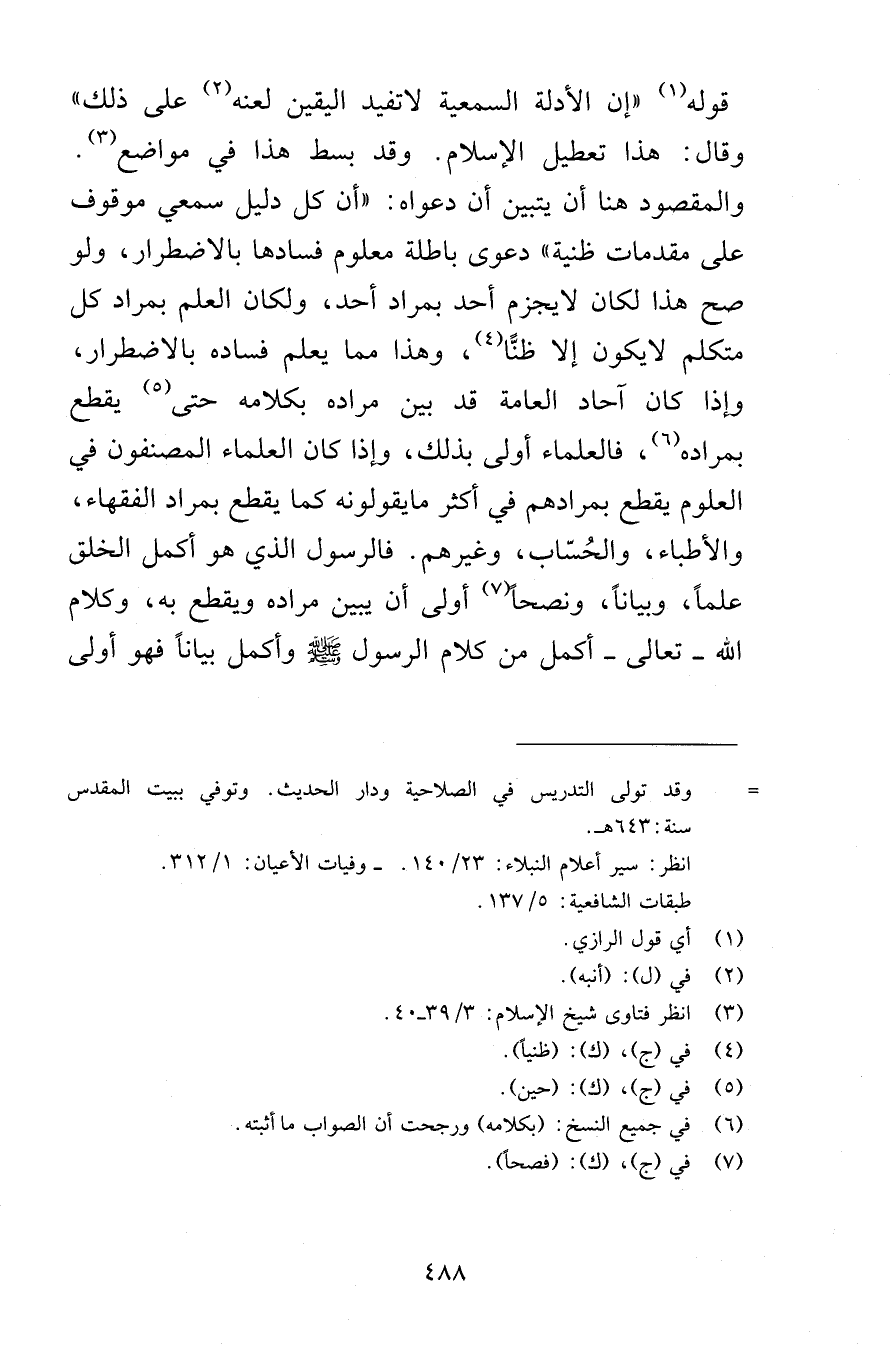 قوله إن الأدلة السمعية لا تفيد اليقين لعنه على ذلك وقال هذا تعطيل الإسلام وقد بسط هذا في مواضع والمقصود هنا أن يتبين أن دعواه أن كل دليل سمعي موقوف على مقدمات ظنية دعوى باطلة معلوم فسادها بالاضطرار ولو صح هذا لكان لا يجزم أحد بمراد أحد ولكان العلم بمراد كل متكلم لا يكون إلا ظنًّا وهذا مما يعلم فساده بالاضطرار وإذا كان آحاد العامة قد بين مراده بكلامه حتى يقطع بمراده فالعلماء أولى بذلك وإذا كان العلماء المصنفون في العلوم يقطع بمرادهم في أكثر ما يقولونه كما يقطع بمراد الفقهاء والأطباء والحُسّاب وغيرهم فالرسول الذي هو أكمل الخلق علماً وبياناً ونصحاً أولى أن يبين مراده ويقطع به وكلام الله تعالى أكمل من كلام الرسول صلى الله عليه وسلم وأكمل بياناً فهو أولى