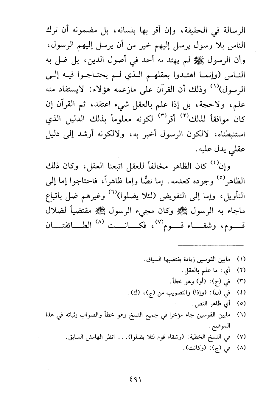 الرسالة في الحقيقة وإن أقر بها بلسانه بل مضمونه أن ترك الناس بلا رسول يرسل إليهم خير من أن يرسل إليهم الرسول وأن الرسول صلى الله عليه وسلم لم يهتد به أحد في أصول الدين بل ضل به الناس وإنما اهتدوا بعقلهم الذي لم يحتاجوا فيه إلى الرسول وذلك أن القرآن على ما زعمه هؤلاء لا يستفاد منه علم ولا حجة بل إذا علم بالعقل شيء اعتقد ثم القرآن إن كان موافقاً لذلك أقر لكونه معلوماً بذلك الدليل الذي استنبطناه لا لكون الرسول أخبر به ولا لكونه أرشد إلى دليل عقلي يدل عليه وإن كان الظاهر مخالفاً للعقل اتبعنا العقل وكان ذلك الظاهر وجوده كعدمه إما نصًّا وإما ظاهراً فاحتاجوا إما إلى التأويل وإما إلى التفويض لئلا يضلوا وغيرهم ضل باتباع ما جاء به الرسول صلى الله عليه وسلم وكان مجيء الرسول صلى الله عليه وسلم مقتضياً لضلال قوم فكانت الطائفتان