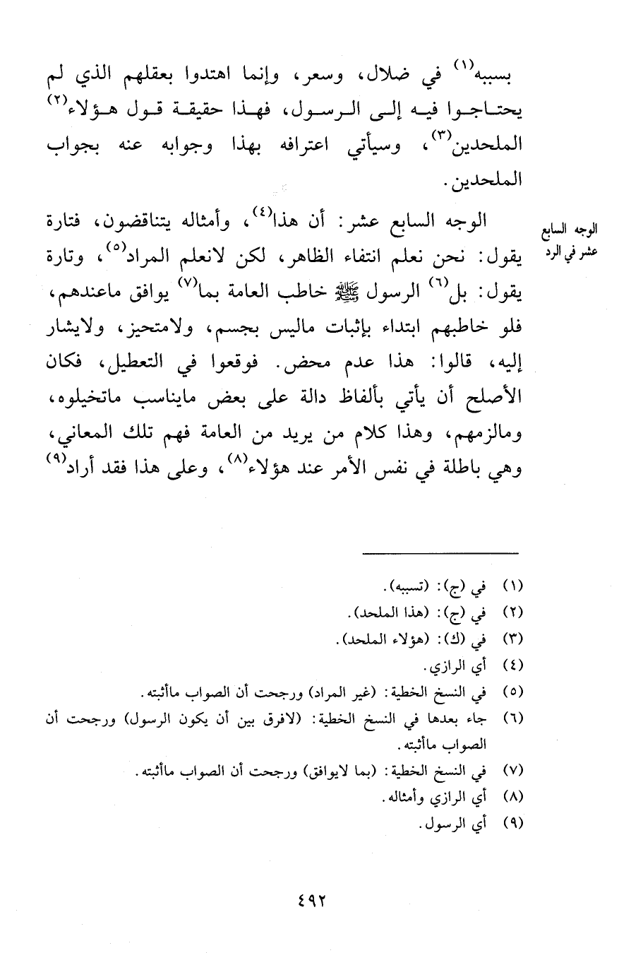 بسببه في ضلال وسعر وإنما اهتدوا بعقلهم الذي لم يحتاجوا فيه إلى الرسول فهذا حقيقة قول هؤلاء الملحدين وسيأتي اعترافه بهذا وجوابه عنه بجواب الملحدين الوجه السابع عشر أن هذا وأمثاله يتناقضون فتارة يقول نحن نعلم انتفاء الظاهر لكن لا نعلم المراد وتارة يقول بل الرسول صلى الله عليه وسلم خاطب العامة بما يوافق ما عندهم فلو خاطبهم ابتداء بإثبات ما ليس بجسم ولا متحيز ولا يشار إليه قالوا هذا عدم محض فوقعوا في التعطيل فكان الصلح أن يأتي بألفاظ دالة على بعض ما يناسب ما تخيلوه وما لزمهم وهذا كلام من يريد من العامة فهم تلك المعاني وهي باطلة في نفس الأمر عند هؤلاء وعلى هذا فقد أراد
