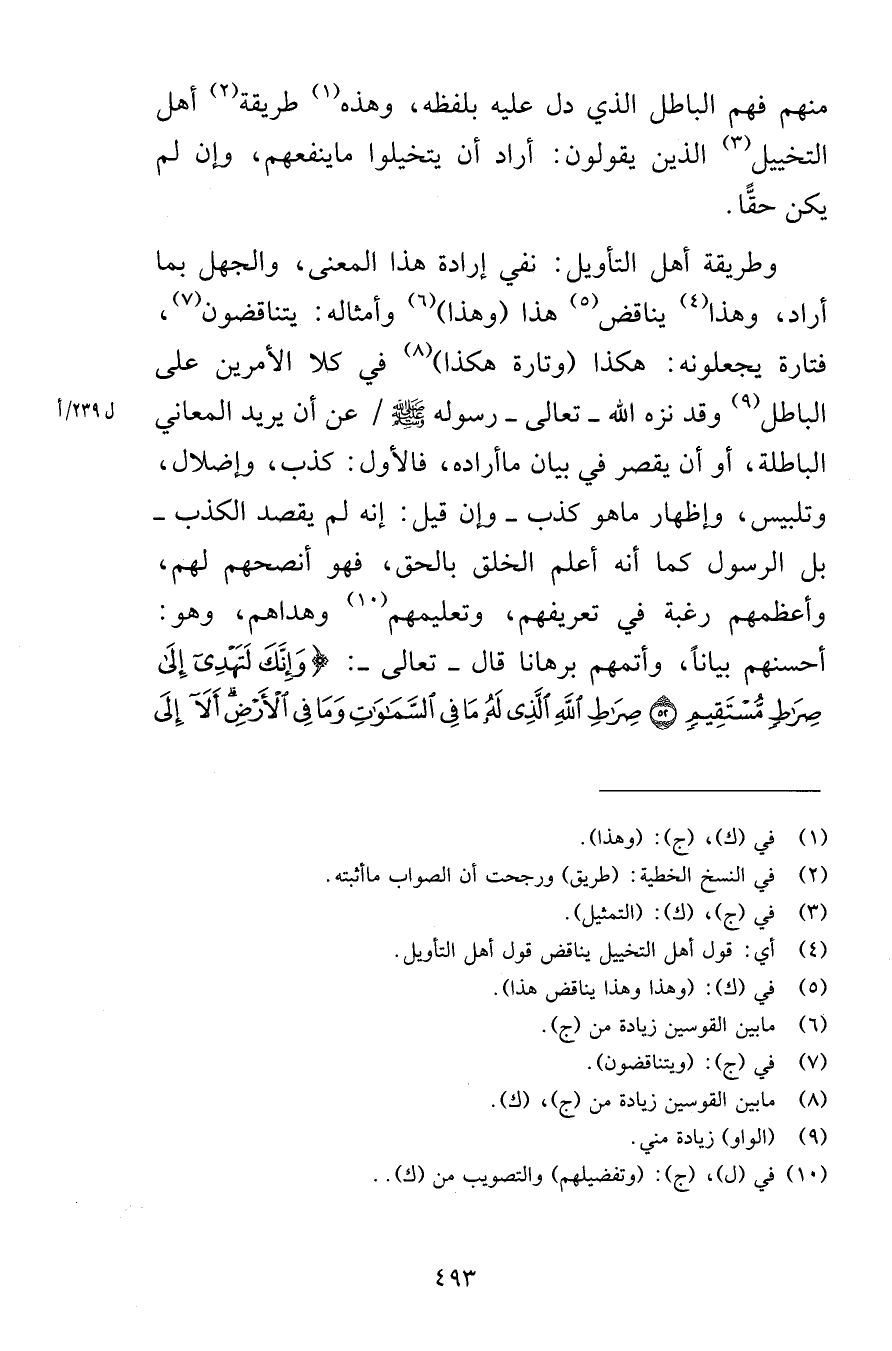 منهم فهم الباطل الذي دل عليه بلفظه وهذه طريقة أهل التخييل الذين يقولون أرادوا أن يتخيلوا ما ينفعهم وإن لم يكن حقًّا وطريقة أهل التأويل نفي إرادة هذا المعنى والجهل بما أراد وهذا يناقض هذا وهذا وأمثاله يتناقضون فتارة يجعلونه هكذا وتارة هكذا في كلا الأمرين على الباطل وقد نزه الله تعالى رسوله صلى الله عليه وسلم عن أن يريد المعاني الباطلة أو أن يقصر في بيان ما أراده فالأول كذب وإضلال وتلبيس وإظهار ما هو كذب وإن قيل إنه لم يقصد الكذب بل الرسول كما أنه أعلم اخلق بالحق فهو أنصحهم لهم وأعظمهم رغبة في تعريفهم وتعليمهم وهداهم وهو أحسنهم بياناً وأتمهم برهانا قال تعالى وَإِنَّكَ لَتَهْدِي إِلَى صِرَاطٍ مُسْتَقِيمٍ (52) صِرَاطِ اللَّهِ الَّذِي لَهُ مَا فِي السَّمَاوَاتِ وَمَا فِي الْأَرْضِ أَلَا إِلَى