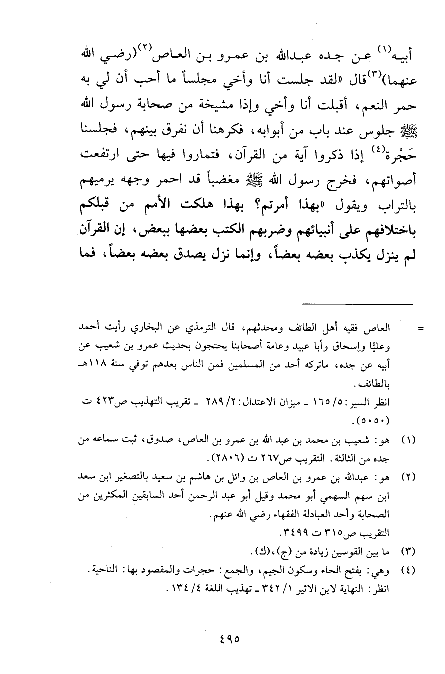 أبيه عن جده عبد الله بن عمرو بن العاص رضي الله عنهما قال لقد جلست أنا وأخي مجلساً ما أحب أن لي به حمر النعم أقبلت أما وأخي وإذا مشيخة من أصحاب رسول الله صلى الله عليه وسلم جلوس عند باب من أبوابه فكرهنا أن نفرق بينهم فجلسنا حَجْرة إذا ذكروا آية من القرآن فتماروا فيها حتى ارتفعت أصواتهم فخرج رسول الله صلى الله عليه وسلم مغضباً قد احمر وجهه يرميهم بالتراب ويقول بهذا أمرتم بهذا هلكت الأمم من قبلكم باختلافهم على أنبيائهم وضربهم الكتب بعضها ببعض إن القرآن لم ينزل يكذب بعضه بعضاً فما