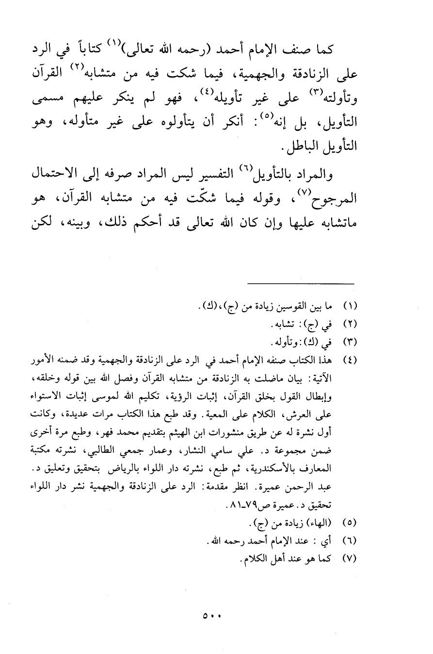 كما صنف الإمام أحمد رحمه الله تعالى كتاباً في الرد على الزنادقة والجهمية فيما شكت فيه من متشابه القرآن وتأولته على غير تأويله فهو لم ينكر عليهم مسمى التأويل بل إنه أنكر أن يتأولوه على غير متأوله وهو التأويل الباطل والمراد بالتأويل التفسير وليس المراد صرفه إلى الاحتمال المرجوح وقوله فيما شكّت فيه من متشابه القرآن هو ما تشابه عليها وإن كان الله تعالى قد أحكم ذلك وبينه لكن