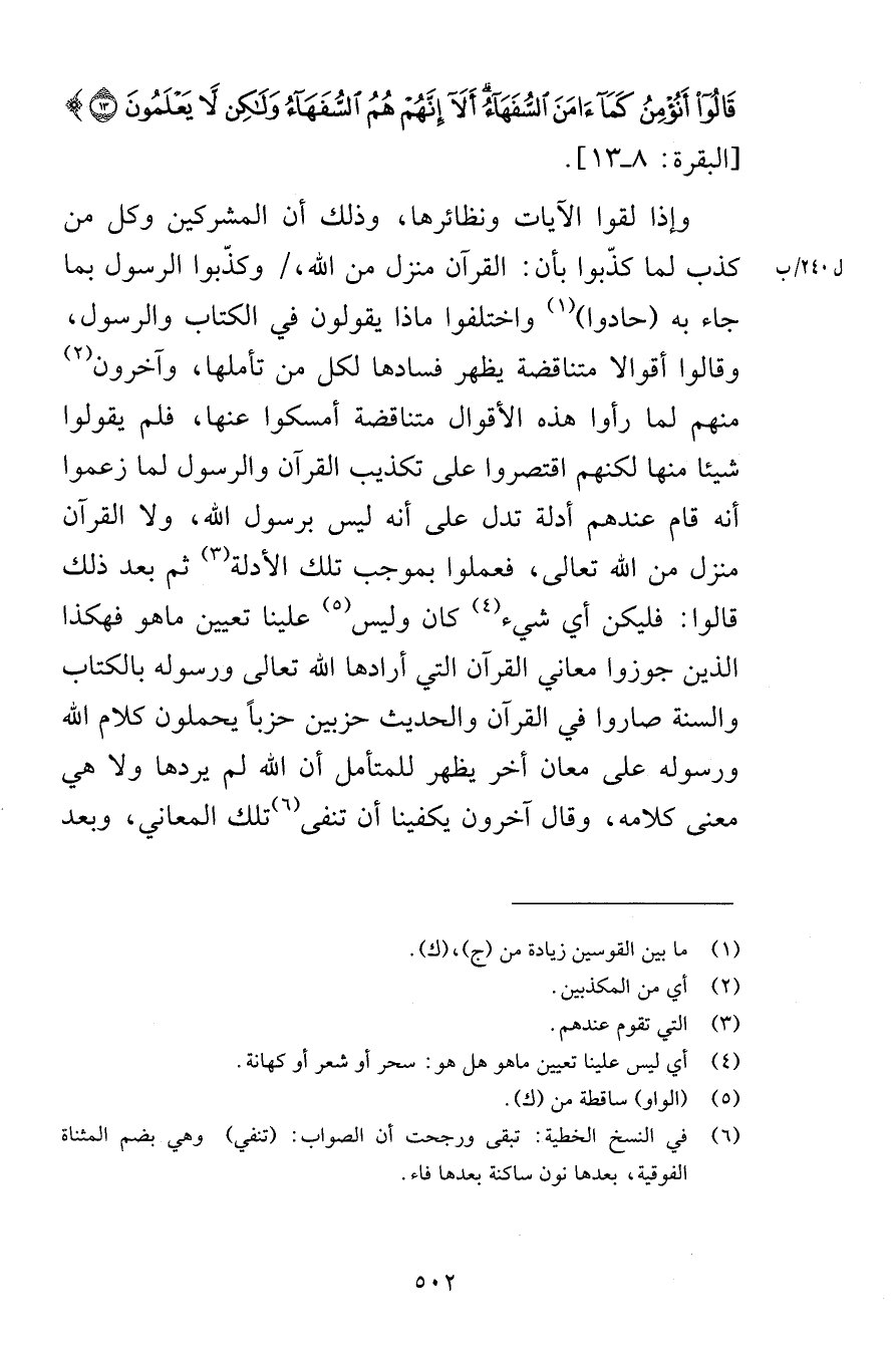 قَالُوا أَنُؤْمِنُ كَمَا آمَنَ السُّفَهَاءُ أَلَا إِنَّهُمْ هُمُ السُّفَهَاءُ وَلَكِنْ لَا يَعْلَمُونَ (13) [البقرة 8-13] وإذا لقوا الآيات ونظائرها وذلك أن المشركين وكل من كذب لما كذّبوا بأن القرآن منزل من الله وكذّبوا الرسول بما جاء به حادوا واختلفوا ماذا يقولون في الكتاب والرسول وقالوا أقوالا متناقضة يظهر فسادها لكل من تأملها وآخرون منهم لما رأوا هذه الأقوال متناقضة أمسكوا عنها فلم يقولوا شيئا منها لكنهم اقتصروا على تكذيب القرآن والرسول لما زعموا أنه قام عندهم أدلة تدل على أنه ليس برسول الله ولا القرآن منزل من الله تعالى فعلموا بموجب تلك الأدلة ثم بعد ذلك قالوا فليكن أي شيء كان وليس علينا تعيين ما هو فهكذا الذين جوزوا معاني القرآن التي أرادها الله تعالى ورسوله بالكتاب والسنة صاروا في القرآن والحديث حزبين حزباً يحملون كلام الله ورسوله على معان أخر يظهر للمتأمل أن الله لم يردها ولا هي معنى كلامه وقال آخرون يكفينا أن تنفى تلك المعاني وبعد