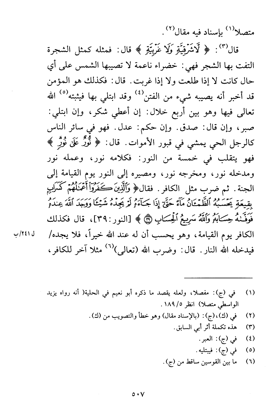 متصلاً بإسناد فيه مقال قال لَا شَرْقِيَّةٍ وَلَا غَرْبِيَّةٍ قال فمثله كمثل الشجرة التفت بها الشجر فهي خضراء ناعمة لا تصيبها الشمس على أي حال كانت لا إذا طلعت ولا إذا غربت قال فكذلك هو المؤمن قد أخبر أنه يصيبه شيء من الفتن وقد ابتلي بها فيثبته الله تعالى فيها وهو بين أربع خلال عن أعطي شكر وإن ابتلي صبر وإن قال صدق وإن حكم عدل فهو في سائر الناس كالرجل الحي يمشي في قبور الأموات قال نُورٌ عَلَى نُورٍ فهو يتقلب في خمسة من النور فكلامه نور وعمله نور ومدخله نور ومخرجه نور ومصيره إلى النور يوم القيامة إلى الجنة ثم ضرب مثل الكافر فقال وَالَّذِينَ كَفَرُوا أَعْمَالُهُمْ كَسَرَابٍ بِقِيعَةٍ يَحْسَبُهُ الظَّمْآنُ مَاءً حَتَّى إِذَا جَاءَهُ لَمْ يَجِدْهُ شَيْئًا وَوَجَدَ اللَّهَ عِنْدَهُ فَوَفَّاهُ حِسَابَهُ وَاللَّهُ سَرِيعُ الْحِسَابِ (39) [النور 39] قال فكذلك الكافر يوم القيامة وهو يحسب أن له عند الله خيراً فلا يجده فيدخله الله النار قال وضرب الله تعالى مثلا آخر للكافر