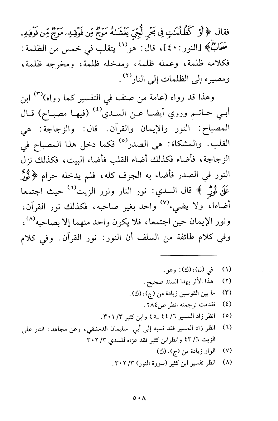 فقال أَوْ كَظُلُمَاتٍ فِي بَحْرٍ لُجِّيٍّ يَغْشَاهُ مَوْجٌ مِنْ فَوْقِهِ مَوْجٌ مِنْ فَوْقِهِ سَحَابٌ [النور 40] قال هو يتقلب في خمس من الظلمة فكلامه ظلمة وعمله ظلمة ومدخله ظلمة ومخرجه ظلمة ومصيره إلى الظلمات إلى النار وهذا قد رواه عامة من صنف في التفسير كما رواه ابن أبي حاتم وروي أيضا عن السدي فيها مصباح قال المصباح النور والإيمان والقرآن قال والزجاجة هي القلب والمشكاة هي الصدر فكما دخل هذا المصباح في الزجاجة فأضاء فكذلك أضاء القلب فأضاء البيت فكذلك نزل النور في الصدر فأضاء به الجوف كله فلم يدخله حرام نَارٌ نُورٌ عَلَى نُورٍ قال السدي نور النار ونور الزيت حيث اجتمعا أضاءا ولا يضيء واحد بغير صاحب فكذلك نور القرآن ونور الإيمان حين اجتمعا فلا يكون واحد منهما إلا بصاحبه وفي كلام طائفة من السلف أن النور نور القرآن وفي كلام