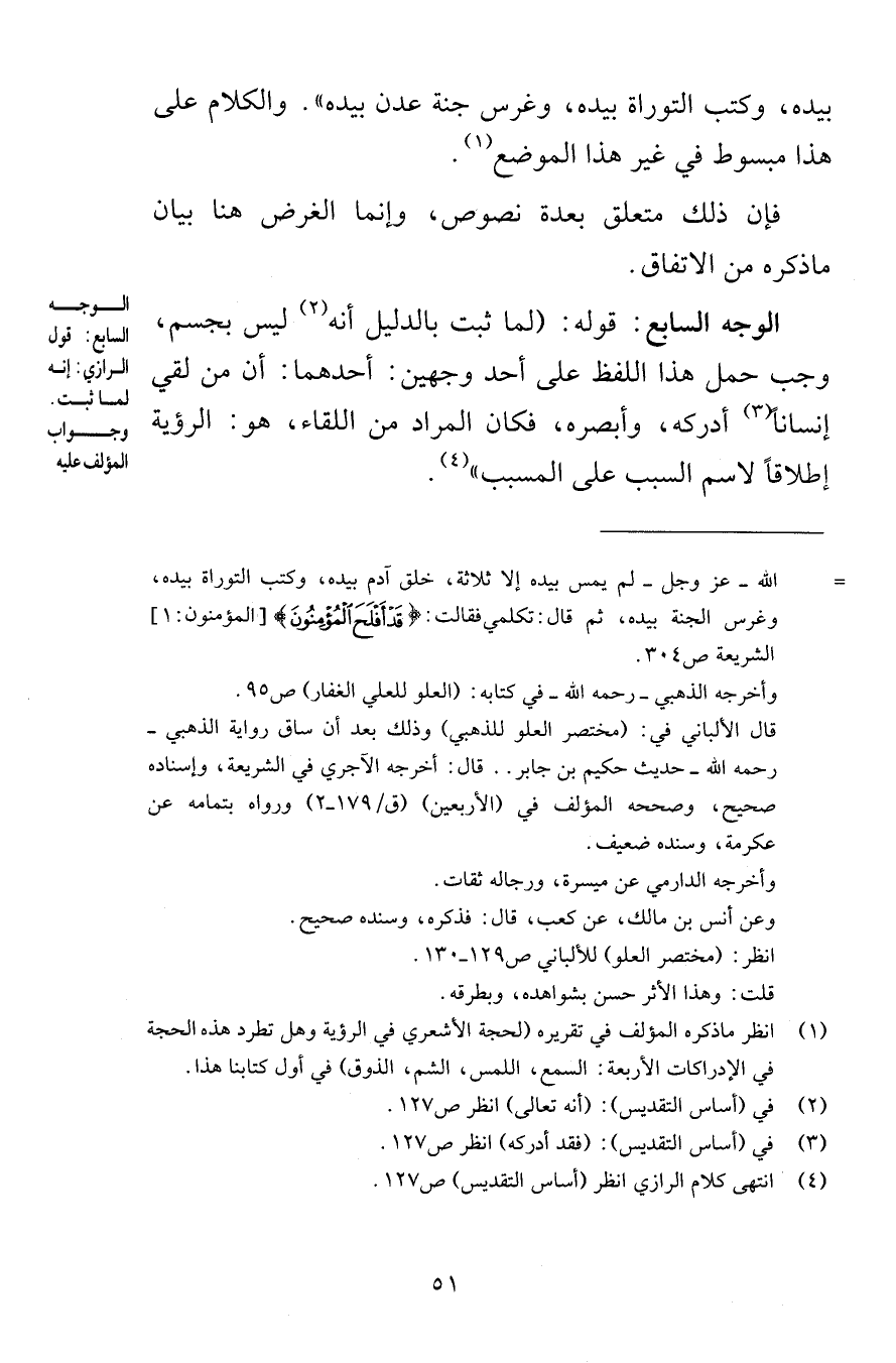 بيده وكتب التوراة بيده وغرس جنة عدن بيده والكلام على هذا مبسوط في غير هذا الموضع فإن ذلك متعلق بعدة نصوص وإنما الغرض هنا بيان ما ذكره من الاتفاق الوجه السابع قوله أنه لما ثبت بالدليل أنه ليس بجسم وجب حمل هذا اللفظ على أحد وجهين أحدهما أن من لقي إنساناً أدركه وأبصره فكان المراد من اللقاء هو الرؤية إطلاقاً لاسم السبب على المسبب