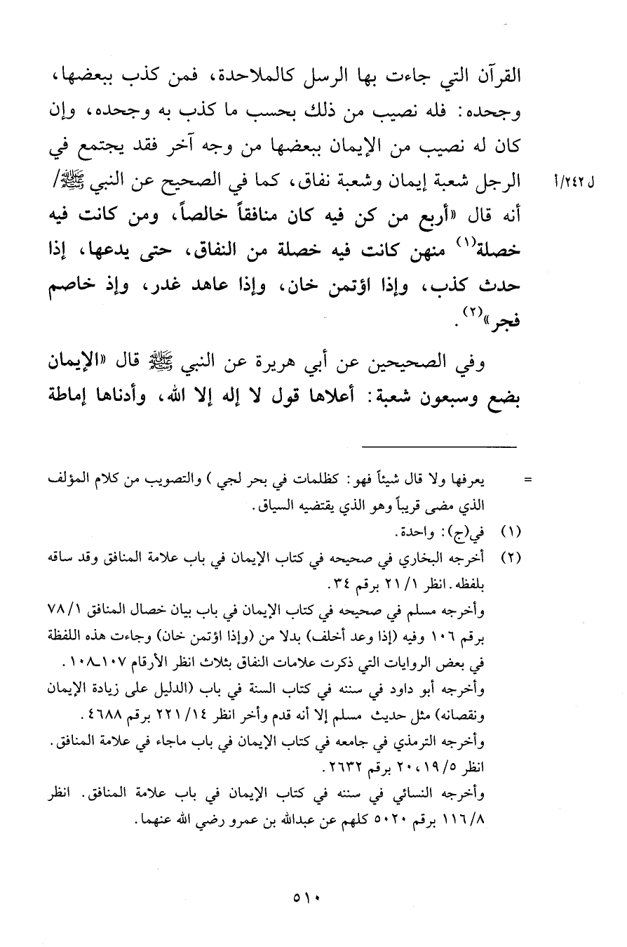 القرآن التي جاءت بها الرسل كالملاحدة فمن كذب ببعضها وجحده فله نصيب من ذلك بحسب ما كذب به وجحده وإن كان له نصيب من الإيمان ببعضها من وجه آخر فقد يجتمع في الرجل شعبة إيمان وشعبة نفاق كما في الصحيح عن النبي صلى الله عليه وسلم أنه قال أربع من كن فيه كان منافقاً خالصاً ومن كانت فيه خصلة منهن كانت فيه خصلة من النفاق حتى يدعها إذا حدث كذب وإذا اؤتمن خان وإذا عاهد غدر وإذا خاصم فجر وفي الصحيحين عن أبي هريرة عن النبي صلى الله عليه وسلم قال الإيمان بضع وسبعون شعبة أعلاها قول لا إله إلا الله وأدناها إماطة