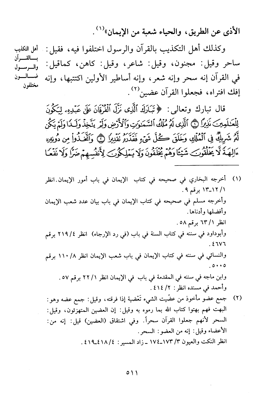 الأذى عن الطريق والحياء شعبة من الإيمان وكذلك أهل التكذيب بالقرآن والرسول اختلفوا فيه فقيل ساحر وقيل مجنون وقيل شاعر وقيل كاهن كما قيل في القرآن إنه سحر وإنه شعر وإنه أساطير الأولين اكتتبها وإنه إفك افتراه فجعلوا القرآن عضين قال تبارك وتعالى تَبَارَكَ الَّذِي نَزَّلَ الْفُرْقَانَ عَلَى عَبْدِهِ لِيَكُونَ لِلْعَالَمِينَ نَذِيرًا (1) الَّذِي لَهُ مُلْكُ السَّمَاوَاتِ وَالْأَرْضِ وَلَمْ يَتَّخِذْ وَلَدًا وَلَمْ يَكُنْ لَهُ شَرِيكٌ فِي الْمُلْكِ وَخَلَقَ كُلَّ شَيْءٍ فَقَدَّرَهُ تَقْدِيرًا (2) وَاتَّخَذُوا مِنْ دُونِهِ آلِهَةً لَا يَخْلُقُونَ شَيْئًا وَهُمْ يُخْلَقُونَ وَلَا يَمْلِكُونَ لِأَنْفُسِهِمْ ضَرًّا وَلَا نَفْعًا
