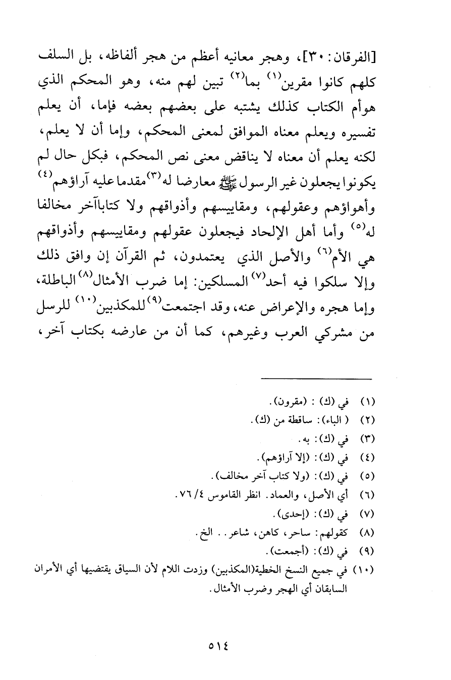 [الفرقان 30] وهجر معانيه أعظم من هجر ألفاظه بل السلف كلهم كانوا مقرين بما تبين لهم منه وهو المحكم الذي هو أم الكتاب كذلك يشتبه على بعضهم بعضه فإما أن يعلم تفسيره ويعلم معناه الموافق لمعنى المحكم وإما أن لا يعلم لكنه يعلم أن معناه لا يناقض معنى نص المحكم فبكل حال لم يكونوا يجعلون غير الرسول صلى الله عليه وسلم معارضا له مقدما عليه آراؤهم وأهواؤهم وعقولهم ومقاييسهم وأذواقهم ولا كتابا آخر مخالفا له وأما أهل الإلحاد فيجعلون عقولهم ومقاييسهم وأذواقهم هي الأم والأصل الذي يعتمدون ثم القرآن إن وافق ذلك وإلا سلكوا فيه أحد المسلكين إما ضرب الأمثال الباطلة وإما هجره والإعراض عنه وقد اجتمعت للمكذبين للرسل من مشركي العرب وغيرهم كما أن من عارضه بكتاب آخر