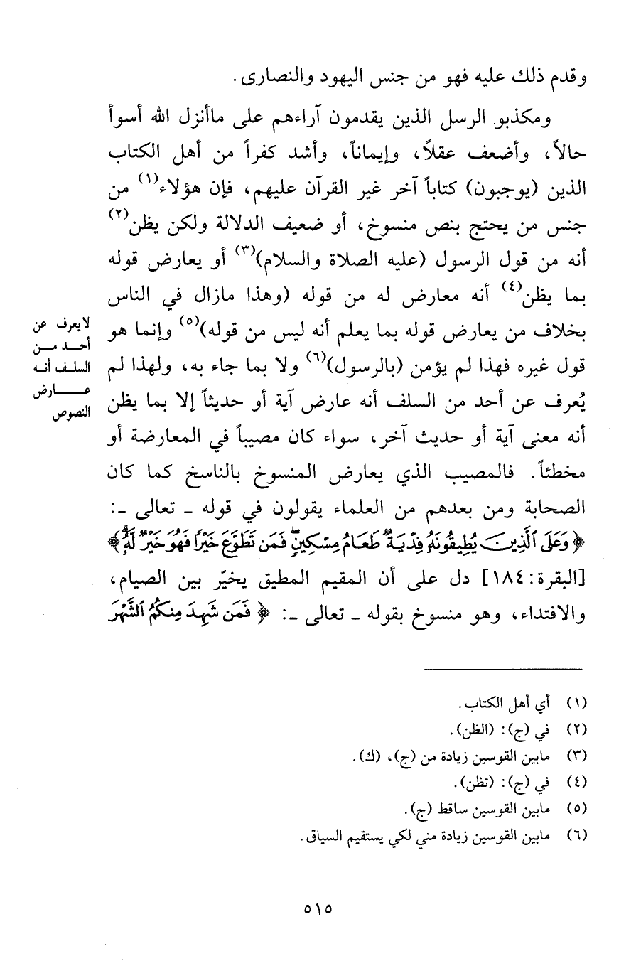 وقدم ذلك عليه فهم من جنس اليهود والنصارى ومكذبو الرسل الذين يقدمون آراءهم على ما أنزل الله أسوأ حالاً وأضعف عقلاً وإيماناً وأشد كفراً من أهل الكتاب الذين يوجبون كتاباً آخر غير القرآن عليهم فإن هؤلاء من جنس من يحتج بنص منسوخ أو ضعيف الدلالة ولكن يظن أنه من قول الرسول عليه الصلاة والسلام أو يعارض قوله بما يظن أنه معارض له من قوله وهذا مازال في الناس بخلاف من يعارض قوله بما يعلم أنه ليس من قوله وإنما هو قول غيره فهذا لم يؤمن بالرسول ولا بما جاء به ولهذا لم يُعرف عن أحد من السلف أنه عارض آية أو حديثاً إلا بما يظن أنه معنى آية أو حديث آخر سواء كان مصيباً في المعارضة أو مخطئاً فالمصيب الذي يعارض المنسوخ بالناسخ كما كان الصحابة ومن بعدهم من العلماء يقولون في قوله تعالى وَعَلَى الَّذِينَ يُطِيقُونَهُ فِدْيَةٌ طَعَامُ مِسْكِينٍ فَمَنْ تَطَوَّعَ خَيْرًا فَهُوَ خَيْرٌ لَهُ [البقرة 184] دل على أن المقيم المطيق يخيّر بين الصيام والافتداء وهو منسوخ بقوله تعالى فَمَنْ شَهِدَ مِنْكُمُ الشَّهْرَ