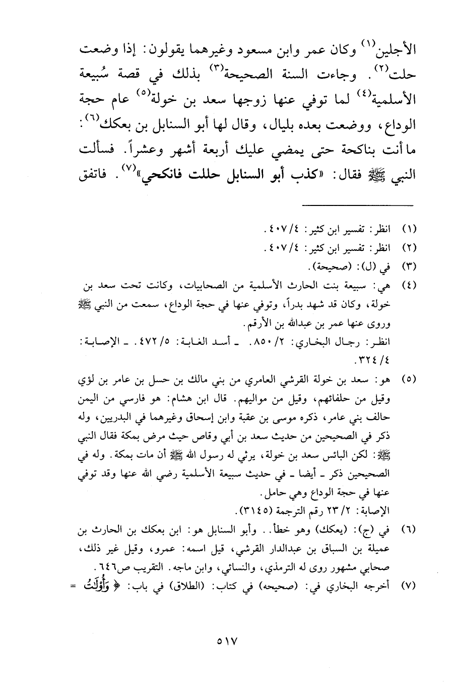 الأجلين وكان عمر وابن مسعود وغيرهما يقولون إذا وضعت حلت وجاءت السنة الصحيحة بذلك في قصة سُبيعة الأسلمية لما توفي عنها زوجها سعد بن خولة عام حجة الوداع ووضعت بعده بليال وقال لها أبو السنابل بن بعكك ما أنت بناكحة حتى يمضي عليك أربعة أشهر وعشراً فسألت النبي صلى الله عليه وسلم فقال كذب أبو السنابل حللت فانكحي فاتفق