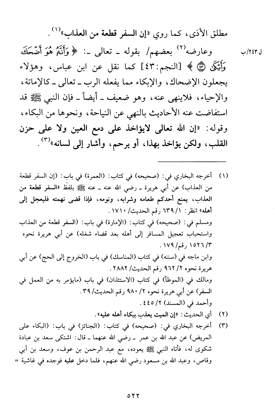 مطلق الأذى كما روي إن السفر قطعة من العذاب وعارضه بعضهم بقوله تعالى وَأَنَّهُ هُوَ أَضْحَكَ وَأَبْكَى (43) [النجم 43] كما نقل عن ابن عباس وهؤلاء يجعلون الإضحاك والإبكاء مما يفعله الرب تعالى كالإماتة والإحياء فلا ينهى عنه وهو ضعيف أيضاً فإن النبي صلى الله عليه وسلم قد استفاضت عنه الأحاديث بالنهي عن النياحة ونحوها من البكاء وقوله إن الله تعالى لا يؤاخذ على دمع العين ولا على حزن القلب ولكن يؤاخذ بهذا أو يرحم وأشار إلى لسانه