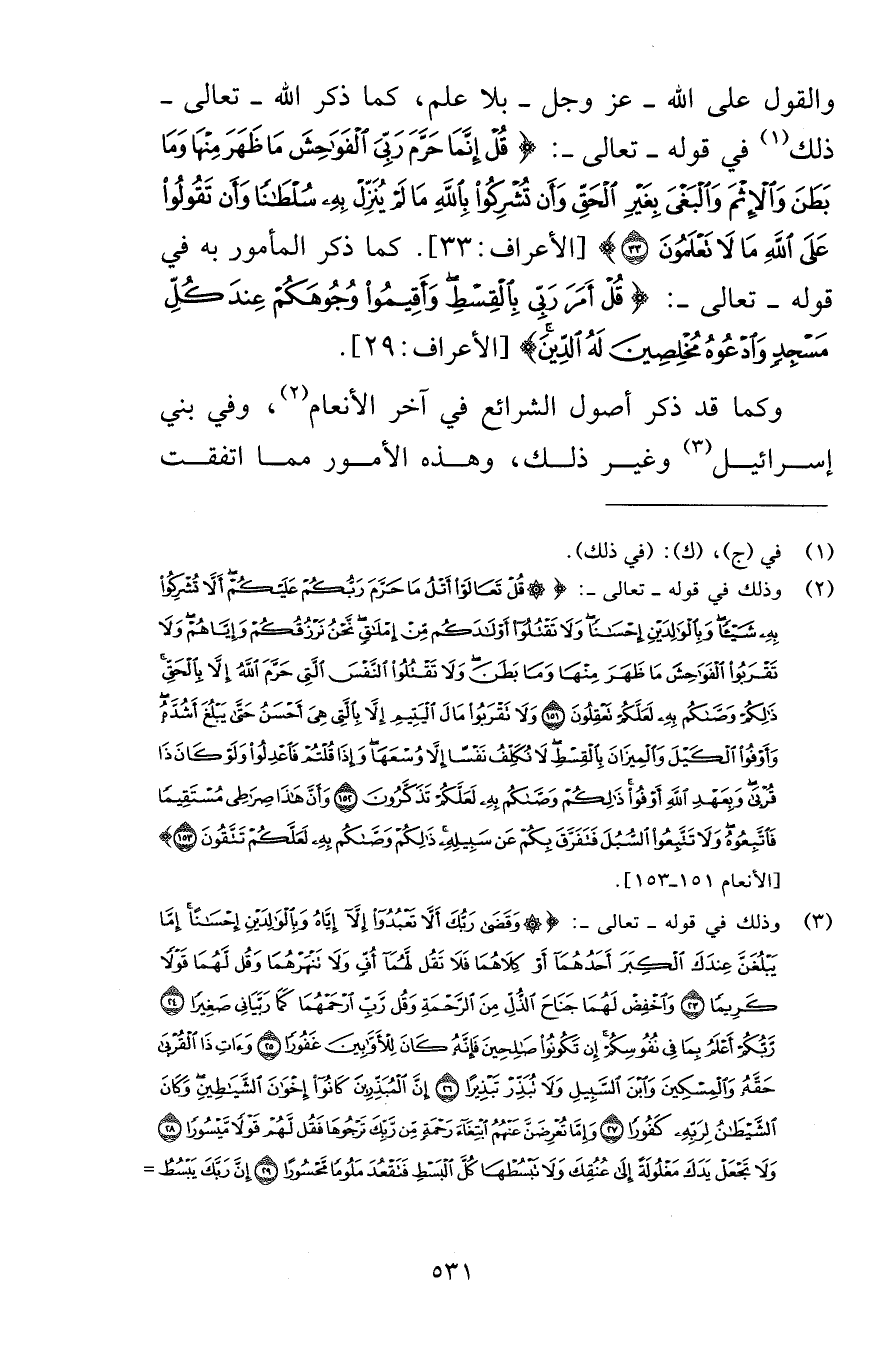 والقول على الله عز وجل بلا علم كما ذكر الله تعالى ذلك في قوله تعالى قُلْ إِنَّمَا حَرَّمَ رَبِّيَ الْفَوَاحِشَ مَا ظَهَرَ مِنْهَا وَمَا بَطَنَ وَالْإِثْمَ وَالْبَغْيَ بِغَيْرِ الْحَقِّ وَأَنْ تُشْرِكُوا بِاللَّهِ مَا لَمْ يُنَزِّلْ بِهِ سُلْطَانًا وَأَنْ تَقُولُوا عَلَى اللَّهِ مَا لَا تَعْلَمُونَ (33) [الأعراف 33] كما ذكر المأمور به في قوله تعالى قُلْ أَمَرَ رَبِّي بِالْقِسْطِ وَأَقِيمُوا وُجُوهَكُمْ عِنْدَ كُلِّ مَسْجِدٍ وَادْعُوهُ مُخْلِصِينَ لَهُ الدِّينَ [الأعراف 29] وكما قد ذكر أصول الشرائع في آخر الأنعام وفي بني إسرائيل وغير ذلك وهذه الأمور مما اتفقت