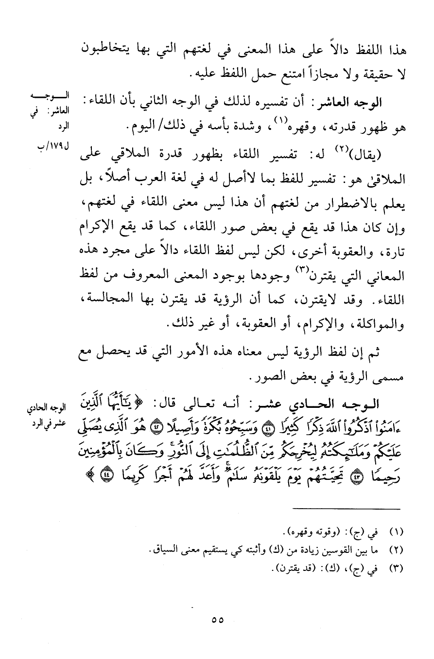هذا اللفظ دالاً على هذا المعنى في لغتهم التي بها يتخاطبون لا حقيقة ولا مجازاً امتنع حمل اللفظ عليه الوجه العاشر أن تفسيره لذلك في الوجه الثاني بأن اللقاء هو ظهور قدرته وقهره وشدة بأسه في ذلك اليوم يقال له تفسير اللقاء بظهور قدرة الملاقي على الملاقى هو تفسير للفظ بما لا أصل له في لغة العرب أصلاً بل يعلم بالاضطرار من لغتهم أن هذا ليس معنى اللقاء في لغتهم وإن كان هذا قد يقع في بعض صور اللقاء كما قد يقع الإكرام تارة والعقوبة أخرى لكن ليس لفظ اللقاء دالاً على مجرد هذه المعاني التي يقترن وجودها بوجود المعنى المعروف من لفظ اللقاء وقد لا يقترن كما أن الرؤية قد يقترن بها المجالسة والمواكلة والإكرام أو العقوبة أو غير ذلك ثم إن لفظ الرؤية ليس معناه هذه الأمور التي قد يحصل مع مسمى الرؤية في بعض الصور الوجه الحادي عشر أنه قال تعالى يَا أَيُّهَا الَّذِينَ آمَنُوا اذْكُرُوا اللَّهَ ذِكْرًا كَثِيرًا (41) وَسَبِّحُوهُ بُكْرَةً وَأَصِيلًا (42) هُوَ الَّذِي يُصَلِّي عَلَيْكُمْ وَمَلَائِكَتُهُ لِيُخْرِجَكُمْ مِنَ الظُّلُمَاتِ إِلَى النُّورِ وَكَانَ بِالْمُؤْمِنِينَ رَحِيمًا (43) تَحِيَّتُهُمْ يَوْمَ يَلْقَوْنَهُ سَلَامٌ وَأَعَدَّ لَهُمْ أَجْرًا كَرِيمًا (44)