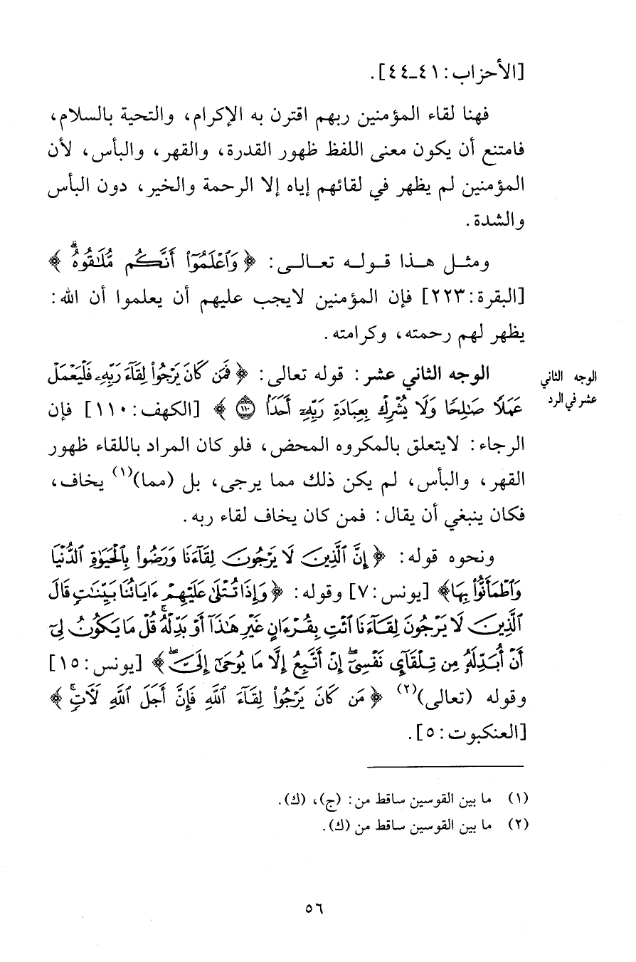 [الأحزاب 41-44] فهنا لقاء المؤمنين ربهم اقترن به الإكرام والتحية بالسلام فامتنع أن يكون معنى الفظ ظهور القدرة والقهر والبأس لأن المؤمنين لم يظهر في لقائهم إياه إلا الرحمة والخير دون البأس والشدة ومثل هذا قوله تعالى وَاعْلَمُوا أَنَّكُمْ مُلَاقُوهُ [البقرة 223] فإن المؤمنين لا يجب عليهم أن يعلموا أن الله يظهر لهم رحمته وكرامته الوجه الثاني عشر قوله تعالى فَمَنْ كَانَ يَرْجُو لِقَاءَ رَبِّهِ فَلْيَعْمَلْ عَمَلًا صَالِحًا وَلَا يُشْرِكْ بِعِبَادَةِ رَبِّهِ أَحَدًا (110) [الكهف 110] فإن الرجاء لا يتعلق بالمكروه المحض فلو كان المراد باللقاء ظهور القهر والبأس لم يكن ذلك مما يرجى بل مما يخاف فكان ينبغي أن يقال فمن كان يخاف لقاء ربه ونحوه قوله إِنَّ الَّذِينَ لَا يَرْجُونَ لِقَاءَنَا وَرَضُوا بِالْحَيَاةِ الدُّنْيَا وَاطْمَأَنُّوا بِهَا [يونس 7] وقوله وَإِذَا تُتْلَى عَلَيْهِمْ آيَاتُنَا بَيِّنَاتٍ قَالَ الَّذِينَ لَا يَرْجُونَ لِقَاءَنَا ائْتِ بِقُرْآنٍ غَيْرِ هَذَا أَوْ بَدِّلْهُ قُلْ مَا يَكُونُ لِي أَنْ أُبَدِّلَهُ مِنْ تِلْقَاءِ نَفْسِي إِنْ أَتَّبِعُ إِلَّا مَا يُوحَى إِلَيَّ [يونس 15] وقوله تعالى مَنْ كَانَ يَرْجُو لِقَاءَ اللَّهِ فَإِنَّ أَجَلَ اللَّهِ لَآتٍ [العنكبوت 5]