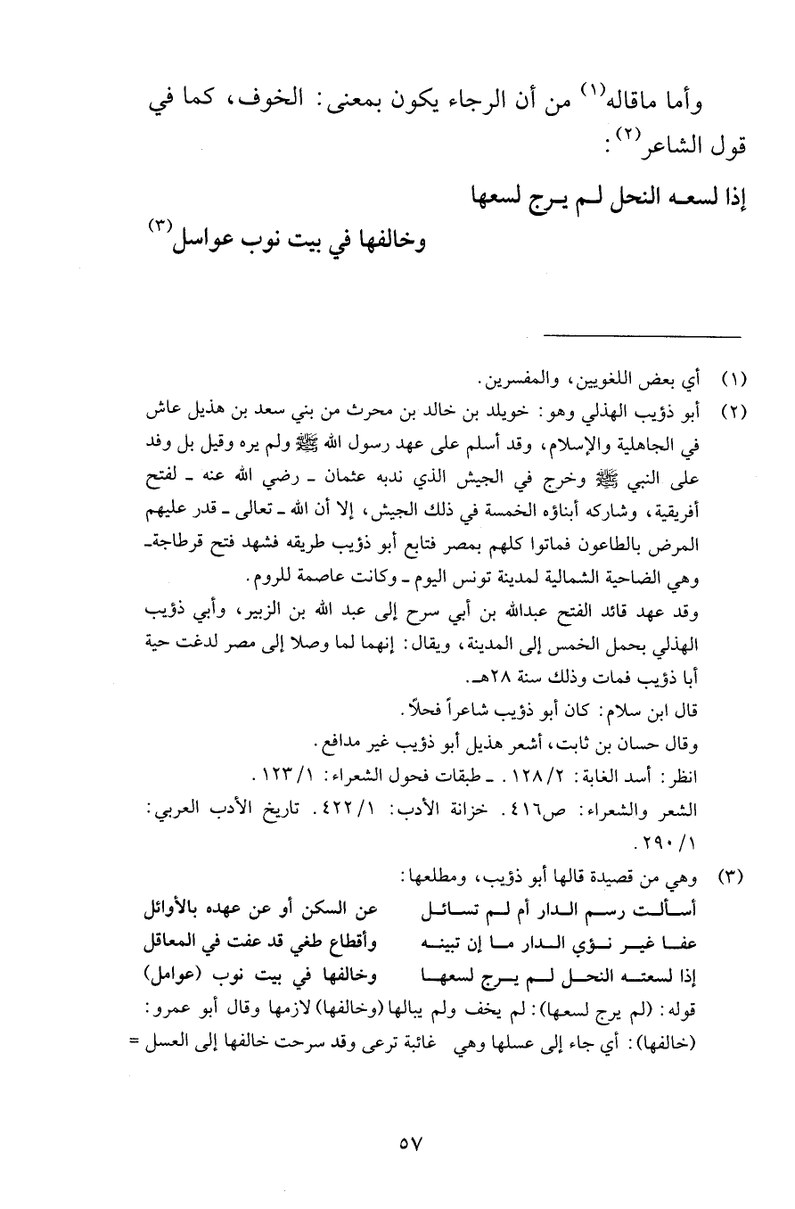وأما ما قاله من أن الرجاء يكون بمعنى الخوف كما في قول الشاعر إذا لسعه النحل لم يرج لسعها وخالفها في بيت نوب عواسل