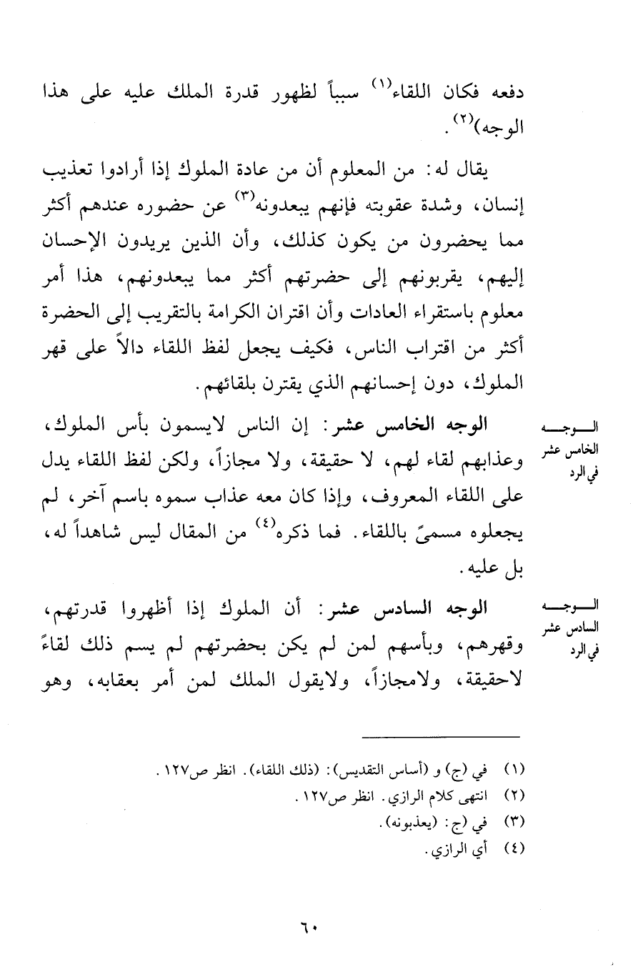 دفعه فكان اللقاء سبباً لظهور قدرة الملك عليه على هذا الوجه يقال له من المعلوم أن من عادة الملوك إذا أرادوا تعذيب إنسان وشدة عقوبته فإنهم يبعدونه عن حضوره عندهم أكثر مما يحضرون من يكون كذلك وأن الذين يريدون الإحسان إليهم يقربونهم إلى حضرتهم أكثر مما يبعدونهم هذا أمر معلوم باستقراء العادات وأن اقتران الكرامة بالتقريب إلى الحضرة أكثر من اقتراب الناس فكيف يجعل لفظ اللقاء دالاً على قهر الملوك دون إحسانهم الذي يقترن بلقائهم الوجه الخامس عشر إن الناس لا يسمون بأس الملوك وعذابهم لقاء لهم لا حقيقة ولا مجازاً ولكن لفظ اللقاء يدل على اللقاء المعروف وإذا كان معه عذاب سموه باسم آخر لم يجعلوه مسمىً باللقاء فما ذكره من المقال ليس شاهداً له بل عليه الوجه السادس عشر أن الملوك إذا أظهروا قدرتهم وقهرهم وبأسهم لمن لم يكن بحضرتهم لم يسم ذلك لقاءً لا حقيقة ولا مجازاً ولا يقول الملك لمن أمر بعقابه وهو