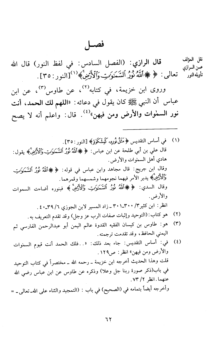 فصل قال الرازي الفصل السادس في لفظ النور قال الله تعالى اللَّهُ نُورُ السَّمَاوَاتِ وَالْأَرْضِ [النور 35] وروى ابن خزيمة في كتابه عن طاوس عن ابن عباس أن النبي صلى الله عليه وسلم كان يقول في دعائه اللهم لك الحمد أنت نور السموات والأرض ومن فيهن قال واعلم أنه لا يصح