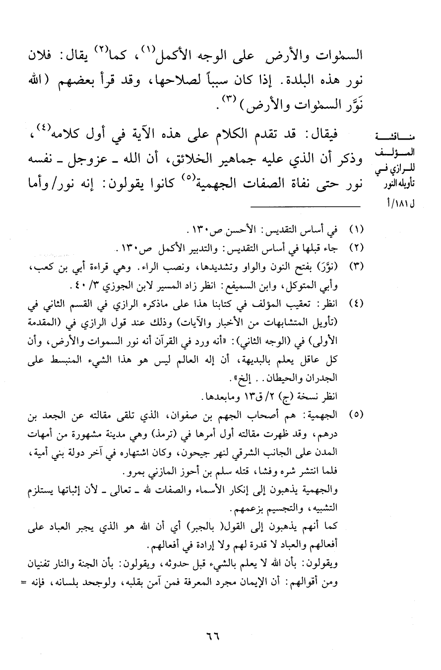 السموات والأرض على الوجه الأكمل كما يقال فلان نور هذه البلدة إذا كان سبباً لصلاحها وقد قرأ بعضهم الله نَوَّر السموات والأرض فيقال قد تقدم الكلام على هذه الآية في أول كلامه وذكر أن الذي عليه جماهير الخلائق أن الله عز وجل نفسه نور حتى نفاة الصفات الجهمية كانوا يقولون إنه نور وأما