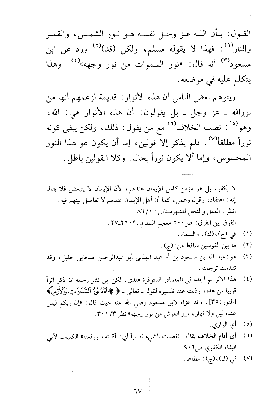 القول بأن الله عز وجل نفسه هو نور الشمس والقمر والنار فهذا لا يقوله مسلم ولكن قد ورد عن ابن مسعود أنه قال نور السموات من نور وجهه وهذا يتكلم عليه في موضعه ويتوهم بعض الناس أن هذه الأنوار قديمة لزعمهم أنها من نور الله عز وجل بل يقولون أن هذه النوار هي الله وهو نصب الخلاف مع من يقول ذلك ولكن يبقى كونه نوراً مطلقاً فلم يذكر إلا قولين إما أن يكون هو هذا النور المحسوس وإما ألا يكون نوراً بحال وكلا القولين باطل