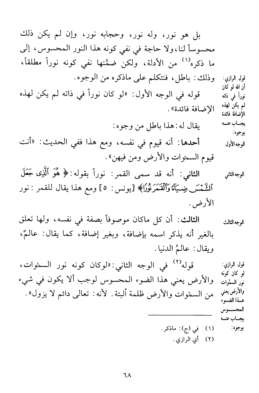 بل هو نور وله نور وحجابه نور وإن لم يكن ذلك محسوساً لنا ولا حاجة في نفي كونه هذا النور المحسوس إلى ما ذكره من الأدلة ولكن ضمَّنها نفي كونه نوراً مطلقاً وذلك باطل فنتكلم على ما ذكره من الوجوه قوله في الوجه الأول لو كان نوراً في ذاته لم يكن لهذه الإضافة فائدة يقال له هذا باطل من وجوه أحدها أنه قيوم في نفسه ومع هذا ففي الحديث أنت قيوم السموات والأرض ومن فيهن الثاني أنه قد سمى القمر نوراً بقوله هُوَ الَّذِي جَعَلَ الشَّمْسَ ضِيَاءً وَالْقَمَرَ نُورًا [يونس 5] ومع هذا يقال للقمر نور الأرض الثالث أن كل ما كان موصوفاً بصفة في نفسه ولها تعلق بالغير أنه يذكر اسمه بإضافة وبغير إضافة كما يقال عالمٌ ويقال عالمُ الدنيا قوله في الوجه الثاني لو كان كونه نور السموات والأرض يعني هذا الضوء المحسوس لوجب ألا يكون في شيء من السموات والأرض ظلمة ألبتة لأنه تعالى دائم لا يزول