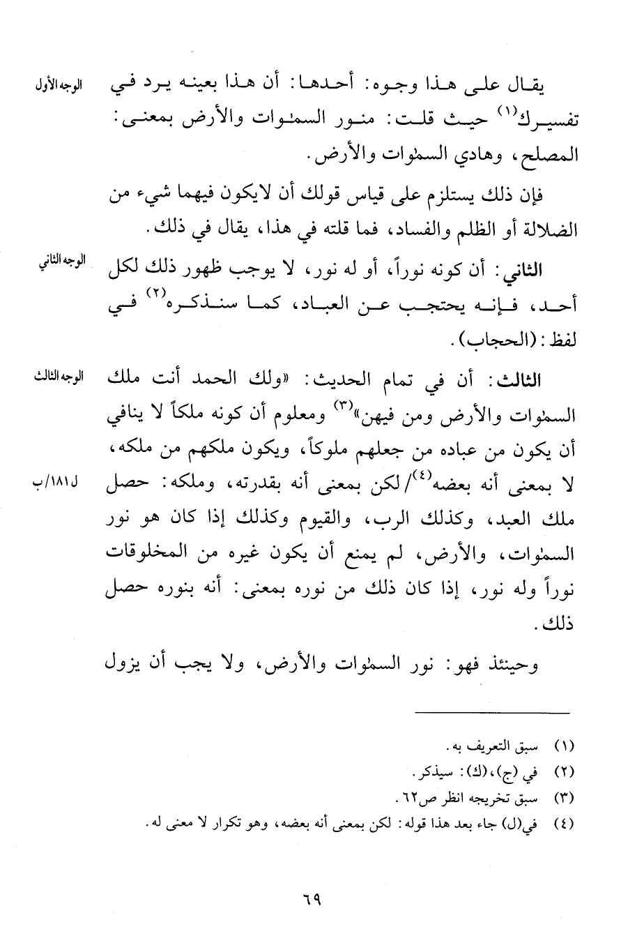 يقال على هذا وجوه أحدها أن هذا بعينه يرد في تفسيرك حيث قلت منور السموات والأرض بمعنى المصلح وهادي السموات والأرض فإن ذلك يستلزم على قياس قولك ألا يكون فيهما شيء من الضلالة أو الظلم والفساد فما قلته في هذا يقال في ذلك الثاني أن كونه نوراً أو له نور لا يوجب ظهور ذلك لكل أحد فإنه يحتجب عن العباد كما سنذكره في لفظ الحجاب الثالث أن في تمام الحديث ولك الحمد أنت ملك السموات والأرض ومن فيهن ومعلوم أن كونه ملكاً لا ينافي أن يكون من عباده من جعلهم ملوكاً ويكون ملكهم من ملكه لا بمعنى انه بعضه لكن بمعنى أنه بقدرته وملكه حصل ملك العبد وكذلك الرب والقيوم وكذلك إذا كان هو نور السموات والأرض لم يمنع أن يكون غيره من المخلوقات نوراً وله نور إذا كان ذلك من نوره بمعنى أنه بنوره حصل ذلك وحينئذ فهو نور السموات والأرض ولا يجب أن يزول