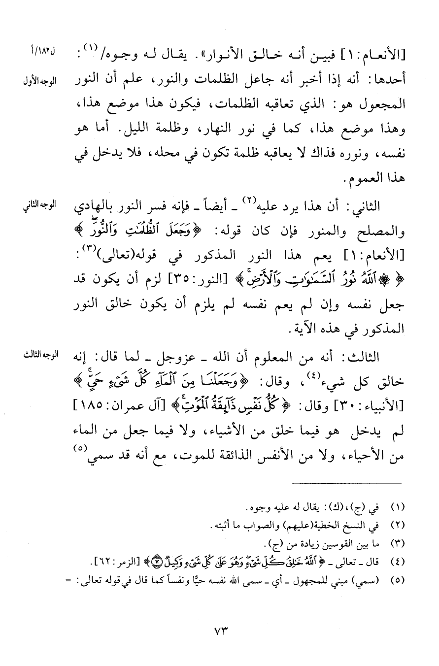 [الأنعام 1] فبين أنه خالق الأنوار يقال له وجوه أحدها أنه إذا أخبر أنه جاعل الظلمات والنور علم أن النور المجعول هو الذي تعاقبه الظلمات فيكون هذا موضع هذا وهذا موضع هذا كما في نور النهار وظلمة الليل أما هو نفسه ونوره فذاك لا يعاقبه ظلمة تكون في محله فلا يدخل في هذا العموم الثاني أن هذا يرد عليه أيضاً فإنه فسر النور بالهادي والمصلح والمنور فإن كان قوله وَجَعَلَ الظُّلُمَاتِ وَالنُّورَ [الأنعام 1] يعم هذا النور المذكور في قوله تعالى اللَّهُ نُورُ السَّمَاوَاتِ وَالْأَرْضِ [النور 35] لزم أن يكون قد جعل نفسه وإن لم يعم نفسه لم يلزم أن يكون خالق النور المذكور في هذه الآية الثالث أنه من المعلوم أن الله عز وجل لما قال إنه خالق كل شيء وقال وَجَعَلْنَا مِنَ الْمَاءِ كُلَّ شَيْءٍ حَيٍّ [الأنبياء 30] وقال كُلُّ نَفْسٍ ذَائِقَةُ الْمَوْتِ [آل عمران 185] لم يدخل هو فيما خلق من الأشياء ولا فيما جعل من الماء من الأحياء ولا من الأنفس الذائقة للموت مع أنه قد سمي