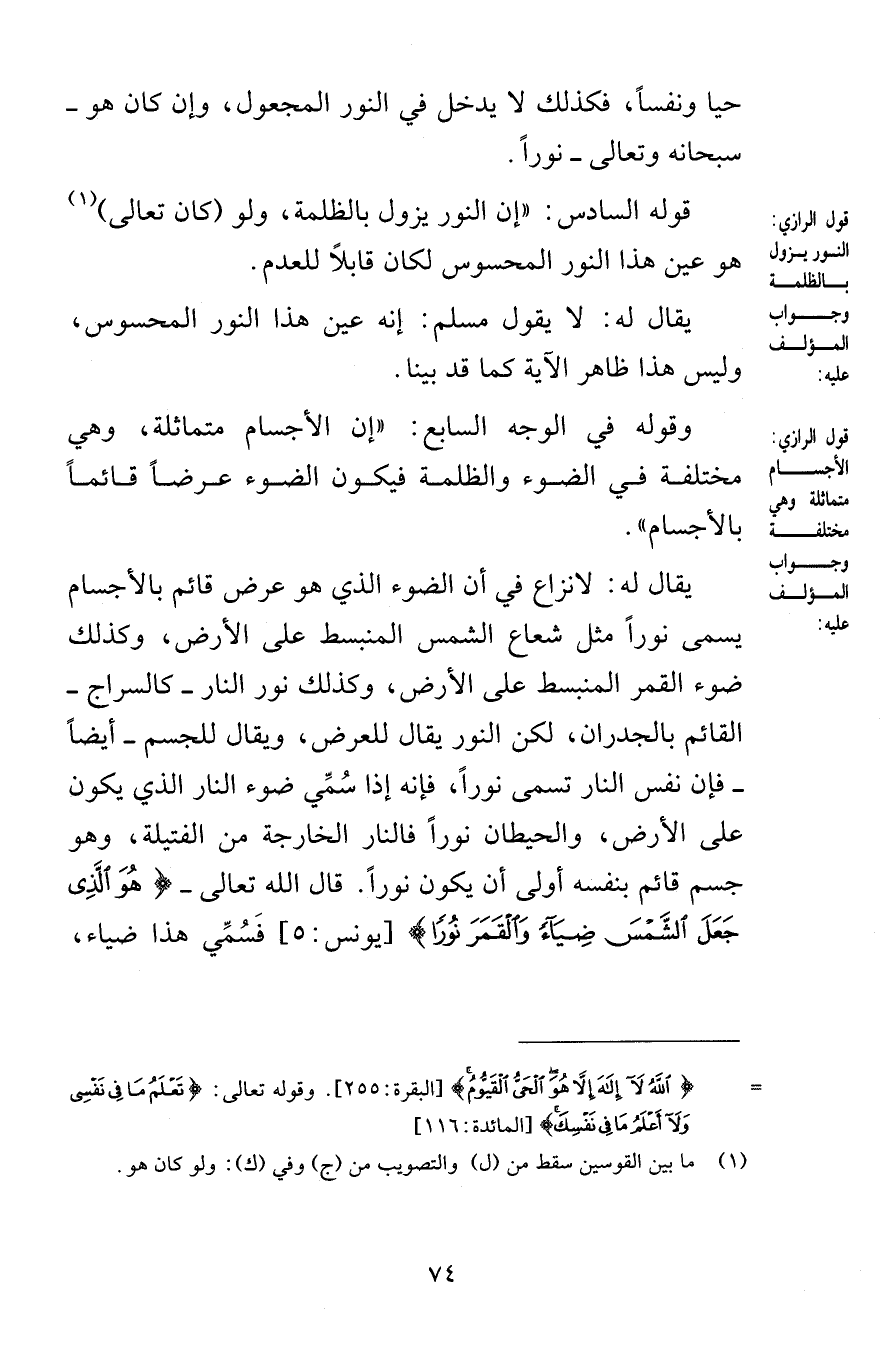 حيا ونفساً فكذلك لا يدخل في النور المجعول وإن كان هو سبحانه وتعالى نوراً قوله السادس إن النور يزول بالظلمة ولو كان تعالى هو عين هذا النور المحسوس لكان قابلاً للعدم يقال له لا يقول مسلم إنه عين هذا النور المحسوس وليس هذا ظاهر الآية كما قد بينا وقوله في الوجه السابع إن الأجسام متماثلة وهي مختلفة في الضوء والظلمة فيكون الضوء عرضاً قائماً بالأجسام يقال له لا نزاع في أن الضوء الذي هو عرض قائم بالأجسام يسمى نوراً مثل شعاع الشمس المنبسط على الأرض وكذلك ضوء القمر المنبسط على الأرض وكذلك نور النار كالسراج القائم بالجدران لكن النور يقال للعرض ويقال للجسم أيضاً فإن نفس النار تسمى نوراً فإنه إذا سُمِّي ضوء النار الذي يكون على الأرض والحيطان نوراً فالنار الخارجة من الفتيلة وهو جسم قائم بنفسه أولى أن يكون نوراً قال الله تعالى هُوَ الَّذِي جَعَلَ الشَّمْسَ ضِيَاءً وَالْقَمَرَ نُورًا [يونس 5] فَسُمِّي هذا ضياء