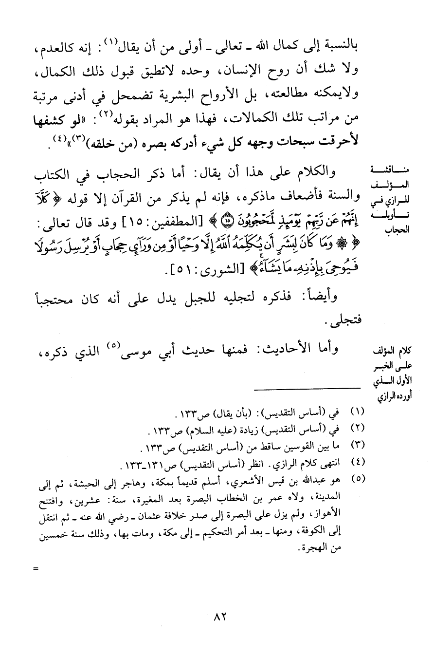 بالنسبة إلى كمال الله تعالى أولى من أن يقال إنه كالعدم ولا شك أن روح الإنسان وحده لا تطيق قبول ذلك الكمال ولا يمكنه مطالعته بل الأرواح البشرية تضمحل في أدنى مرتبة من مراتب تلك الكمالات فهذا هو المراد بقوله لو كشفها لأحرقت سبحات وجهه كل شيء أدركه بصره من خلقه والكلام على هذا أن يقال أما ذكر الحجاب في الكتاب والسنة فأضعاف ما ذكره فإنه لام يذكر من القرآن إلا قوله كَلَّا إِنَّهُمْ عَنْ رَبِّهِمْ يَوْمَئِذٍ لَمَحْجُوبُونَ (15) [المطففين 15] وقد قال تعالى وَمَا كَانَ لِبَشَرٍ أَنْ يُكَلِّمَهُ اللَّهُ إِلَّا وَحْيًا أَوْ مِنْ وَرَاءِ حِجَابٍ أَوْ يُرْسِلَ رَسُولًا فَيُوحِيَ بِإِذْنِهِ مَا يَشَاءُ [الشورى 51] وأيضاً فذكره لتجليه للجبل يدل على أنه كان محتجباً فتجلى وأما الأحاديث فمنها حديث أبي موسى الذي ذكره