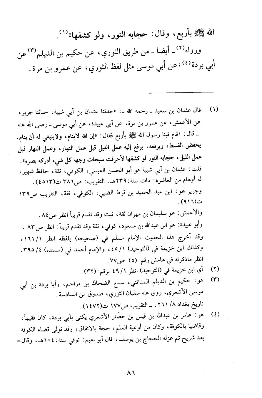 الله صلى الله عليه وسلم بأربع وقال حجابه النور ولو كشفها ورواه أيضا من طريق الثوري عن حكيم بن الديلم عن أبي بردة عن أبي موسى مثل لفظ الثوري عن عمرو بن مرة