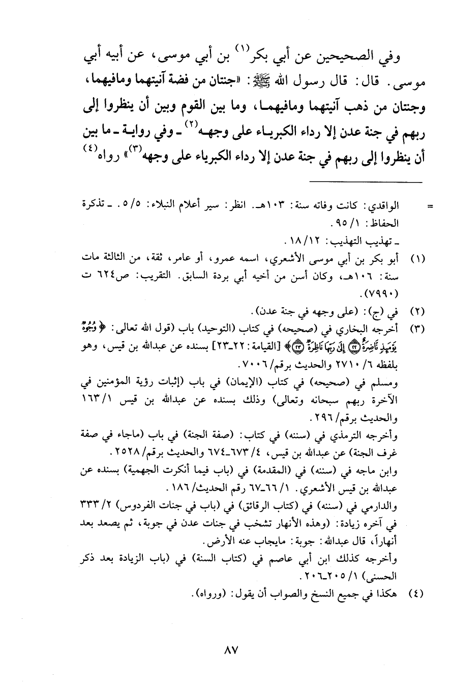 وفي الصحيحين عن أبي بكر بن أبي موسى عن أبيه أبي موسى قال قال رسول الله صلى الله عليه وسلم جنتان من فضة آنيتهما وما فيهما وجنتان من ذهب آنيتهما وما فيهما وما بين القوم وبين أن ينظروا إلى ربهم في جنة عدن إلا رداء الكبرياء على وجهه وفي رواية ما بين أن ينظروا إلى ربهم في جنة عدن إلا رداء الكبرياء على وجهه رواه