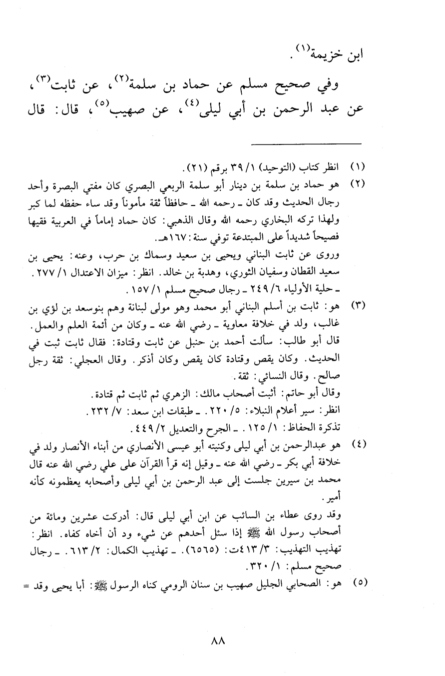 ابن خزيمة وفي صحيح مسلم هن حماد بن سلمة عن ثابت عن عبد الرحمن بن أبي ليلى عن صهيب قال قال