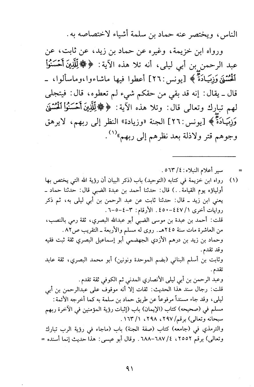 الناس ويختصر عنه حماد بن سلمة أشياء لاختصاصه به ورواه ابن خزيمة وغيره عن حماد بن زيد عن ثابت عن عبد الرحمن بن أبي ليلى أنه تلا هذه الآية لِلَّذِينَ أَحْسَنُوا الْحُسْنَى وَزِيَادَةٌ [يونس 26] أعطوا فيها ما شاءوا وما سألوا قال يقال إنه قد بقي من حقكم شيء لم تعطوه قال فيتجلى لهم تبارك وتعالى قال وتلا هذه الآية لِلَّذِينَ أَحْسَنُوا الْحُسْنَى وَزِيَادَةٌ [يونس 26] الجنة وزيادة النظر إلى ربهم لا يرهق وجوههم قتر ولا ذلة بعد نظرهم إلى ربهم