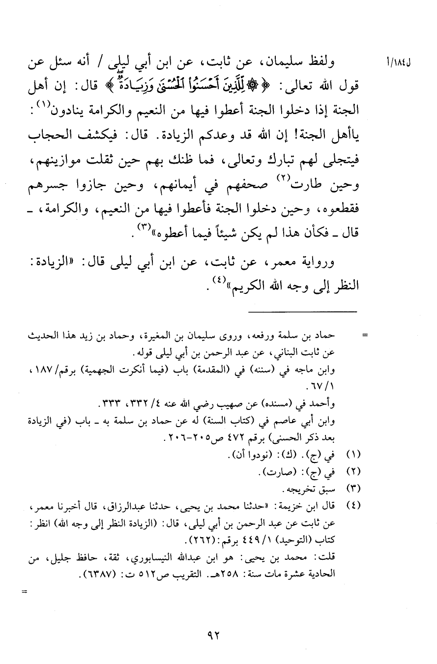 ولفظ سليمان عن ثابت عن ابن أبي ليلى أنه سئل عن قول الله تعالى لِلَّذِينَ أَحْسَنُوا الْحُسْنَى وَزِيَادَةٌ قال إن أهل الجنة إذا دخلوا الجنة أعطوا فيها من النعيم والكرامة ينادون يا أهل الجنة إن الله قد وعدكم الزيادة قال فيكشف الحجاب فيتجلى لهم تبارك وتعالى فما ظنك بهم حيث ثقلت موازينهم وحين طارت صحفهم في أيمانهم وحين جازوا جسرهم فقطعوه وحين دخلوا الجنة فأعطوا فيها من النعيم والكرامة قال فكأن هذا لم يكن شيئاً فيما أعطوه ورواية معمر عن ثابت عن ابن أبي ليلى قال الزيادة النظر إلى وجه الله الكريم