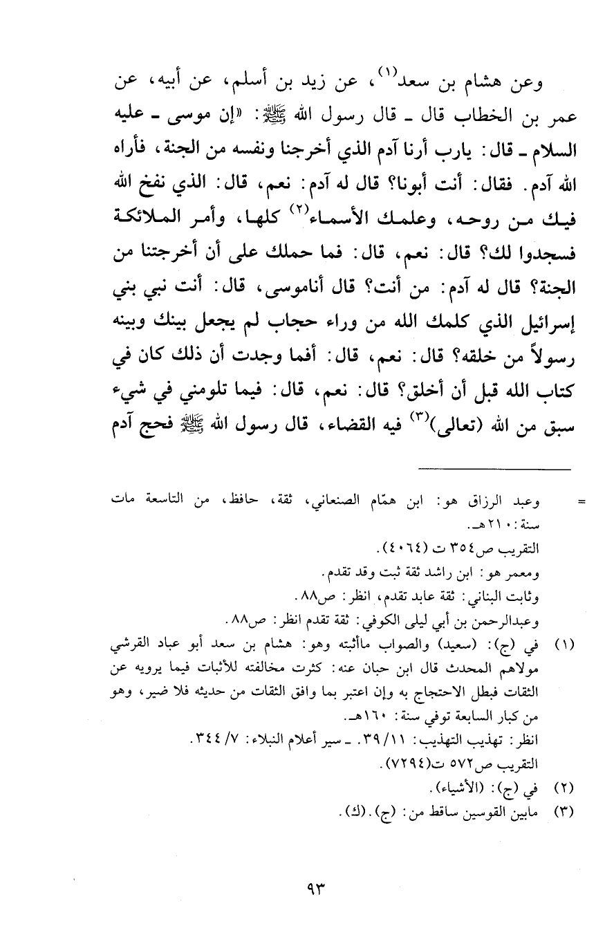 وعن هشام بن سعد عن زيد بن أسلم عن أبيه عن عمرو بن الخطاب قال قال رسول الله صلى الله عليه وسلم إن موسى عليه السلام قال يارب أرنا آدم الذي أخرجنا ونفسه من الجنة فأراه الله آدم فقال أنت أبونا فقال له آدم نعم قال الذي نفخ الله فيك من روحه وعلمك الأسماء كلها وأمر الملائكة فسجدوا لك قال نعم قال فما حملك على أن أخرجتنا من الجنة قال له آدم من أنت قال أنا موسى قال أنت نبي بني إسرائيل الذي كلمك الله من وراء حجاب لم يجعل بينك وبينه رسولاً من خلقه قال نعم قال أفما وجدت أن ذلك في كتاب الله قبل أن أخلق قال نعم قال فيما تلومني في شيء سبق من الله تعالى فيه القضاء قال رسول الله صلى الله عليه وسلم فحج آدم
